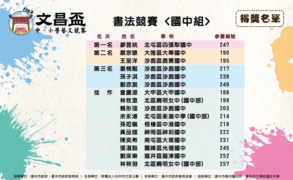 2025-11-18 沙鹿區 沙鹿國中 教務處 報導點閱數:102 次榮譽事蹟在今年的文昌盃中,沙鹿國中的孩子們不只參加比賽—— 他們把日復一日的練習、、對文字與文化的熱愛,通通帶上了舞台。 結果,我們做到了!🔥 📌 本校榮耀成績(書法組) 🥈 第三名:本校三位同學勇奪殊榮! 🎖 佳作:本校一位同學獲得肯定! 每一筆轉折、每一次收放,都藏著孩子們的努力。 沙中孩子,用他們的筆,寫出了最美的風景。🌟
