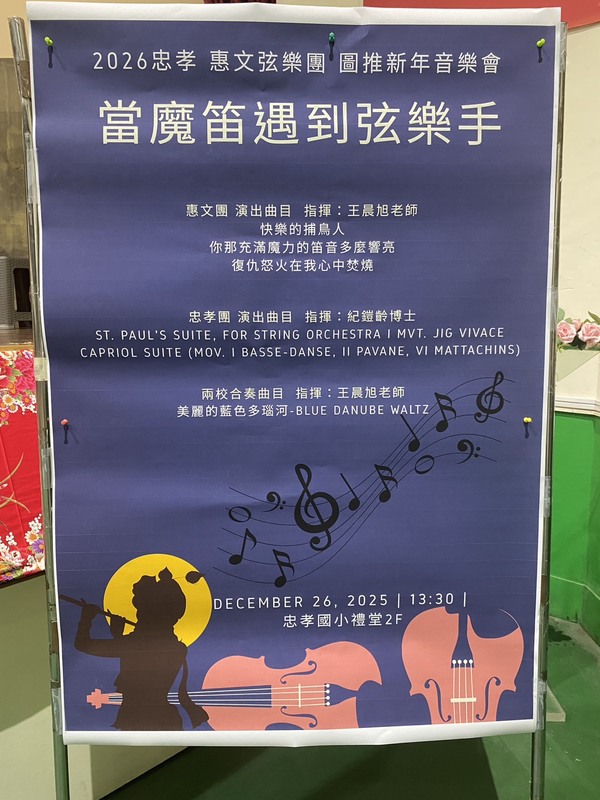 2025-12-26 西區 忠孝國小 教務處 報導點閱數:141 次校園新聞迎接即將到來的2026年新年,忠孝國小再次以創新教學翻轉閱讀想像,於12月26日下午隆重舉辦「當魔笛遇上弦樂手」校際交流音樂會,巧妙結合閱讀推動、戲劇教育與音樂藝術,讓書本中的《神奇魔笛》化為舞台上流動的旋律,展現忠孝百年樹人、時時創新的教育風景。 本次音樂會由忠孝國小弦樂團(榮獲音樂比賽優等並挺進全國賽)攜手惠文國小弦樂團同台交流演出。 活動開場由張耀中校長致詞,肯定學校長期深耕閱讀教育與藝術素養,並透過跨域課程讓學生在多元舞台自信發光;家長會劉鈞豪會長致贈紀念品,表達惠文團蒞校交流的支持與鼓勵。惠文國小洪誌敬校長親自帶隊蒞校交流,並特別準備小禮物致贈忠孝弦樂團學生,為校際情誼增添溫暖與感動。 演出中,忠孝國小弦樂團帶來本次音樂比賽的參賽曲目,展現紮實的演奏實力;惠文國小弦樂團則以《魔笛》相關樂章精彩詮釋,與活動主題相互呼應。壓軸時刻,兩校弦樂團攜手大合奏〈藍色多瑙河〉,悠揚流轉的樂聲彷彿將現場瞬間帶往維也納新年音樂會,為交流音樂會畫下動人而璀璨的句點。現場掌聲不斷,音樂交流的感動在空氣中迴盪。 本次活動圓滿成功,特別感謝閱讀推動主辦設備組房世昕組長用心策畫,圖推老師黃珮瑄協助推動,音樂老師葉韋汝指導與弦樂團紀博士指揮,並感謝後援會會長及全體弦樂團家長們的全力支持,成就一場兼具教育深度與藝術美感的音樂饗宴。 在溫暖的午後時光中,全體參與師生以音樂洗滌心靈、陶冶性情,讓《魔笛》的故事從書頁再次躍動於旋律之中。忠孝國小持續以創新教學注入新學習元素,陪伴孩子體驗多元學習的美好,為百年校史寫下動人而悠揚的新篇章。 #忠孝國小圖推 #忠孝130 #忠孝國小社團