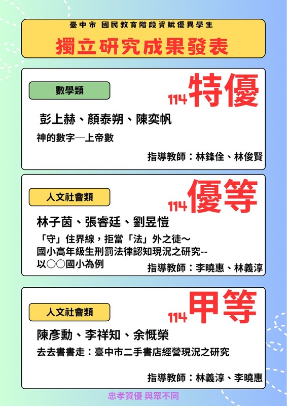 2025-12-31 西區 忠孝國小 輔導室 報導點閱數:122 次榮譽事蹟在「臺中市 114 學年度國民教育階段資賦優異學生獨立研究成果發表」中,忠孝國小資優班再次以亮眼表現脫穎而出。學生於數學類以〈神的數字─上帝數〉榮獲特優;在人文社會類中,〈「守」住界線,拒當「法」外之徒──國小高年級生刑罰法律認知現況之研究〉獲得優等,〈去去書書走:臺中市二手書店經營現況之研究〉亦榮獲甲等,充分展現學生多元探究與深度思考的能力。 這些成果並非偶然,而是忠孝資優長期、系統化培育的累積。課程自中年級起,透過特殊需求課程扎根學生的資料搜尋、閱讀理解、統整分析與表達能力;進入高年級後,引導孩子從興趣出發、學習研究方法、完成為期一年的獨立研究。在教師專業陪伴與引導下,學生學會提問、思考、驗證與表達,不只為比賽而學,更為未來而學。忠孝資優,培養的是能主動學習、勇於探究的孩子。 忠孝國小資優班網頁:https://sites.google.com/jses.tc.edu.tw/jsesgifted