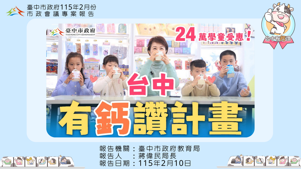 守護學童營養不中斷!台中市政府將於114學年度第二學期開學日(2月23日)啟動「台中有鈣讚計畫」,計畫啟動前,市長盧秀燕親赴合作通路門市視察並模擬演練兌換流程,與學(幼)童一同實際體驗乳品兌領方式和流程,也讓孩子親自感受到這項政策的方便和友善。盧市長表示,為了孩子們的健康,更快樂的成長,台中市受惠的學童大約有24萬人,經費高達2.8億,新的學期,市府將提供學童免費領取牛奶或豆漿。 盧市長指出,「台中有鈣讚計畫」提供台中市公立國小及公私立幼兒園學(幼)童,於學期中每週可兌領一瓶乳品,品項除鮮奶外,也提供豆漿等選擇,兼顧乳糖不耐學童需求,落實多元、健康的營養補充政策,而為了養成孩童規律喝牛奶 ...