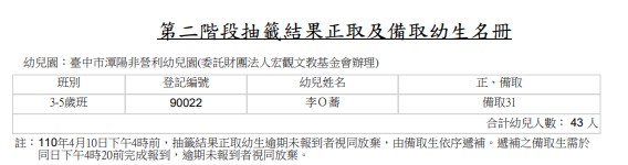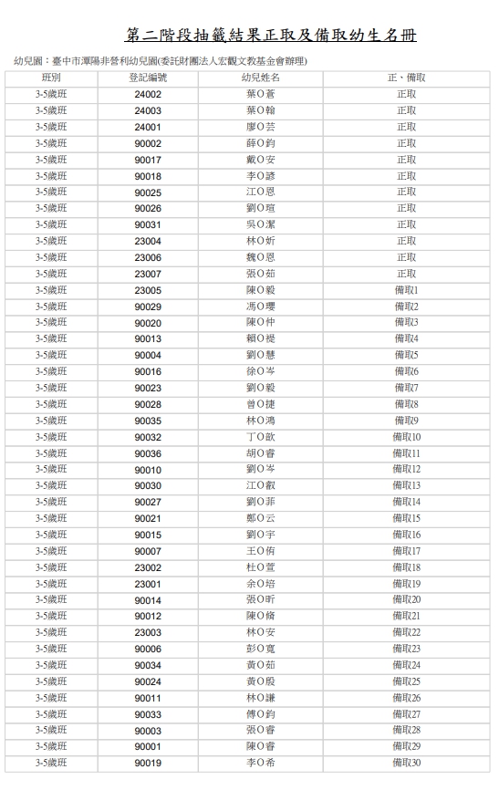 110年度台中市潭子區潭陽非營利幼兒園(委託財團法人宏觀文教基金會辦理)第二階段招生錄取名單公告