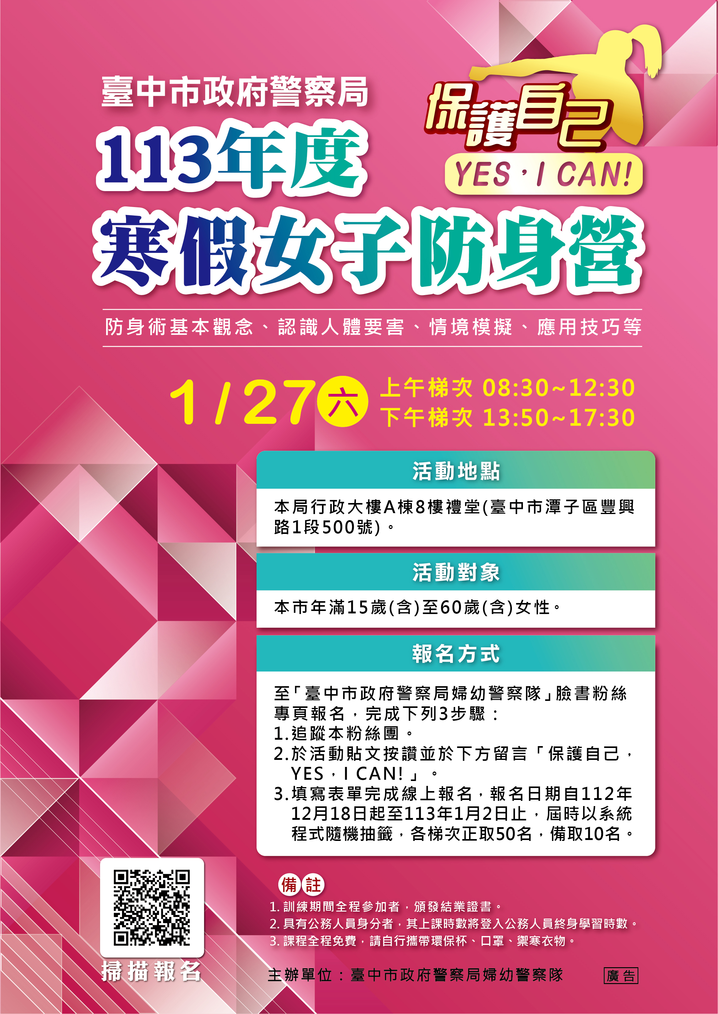 有關本府警察局辦理113年度「寒假女子防身營-保護自己,YES,I CAN!」活動,請查照。