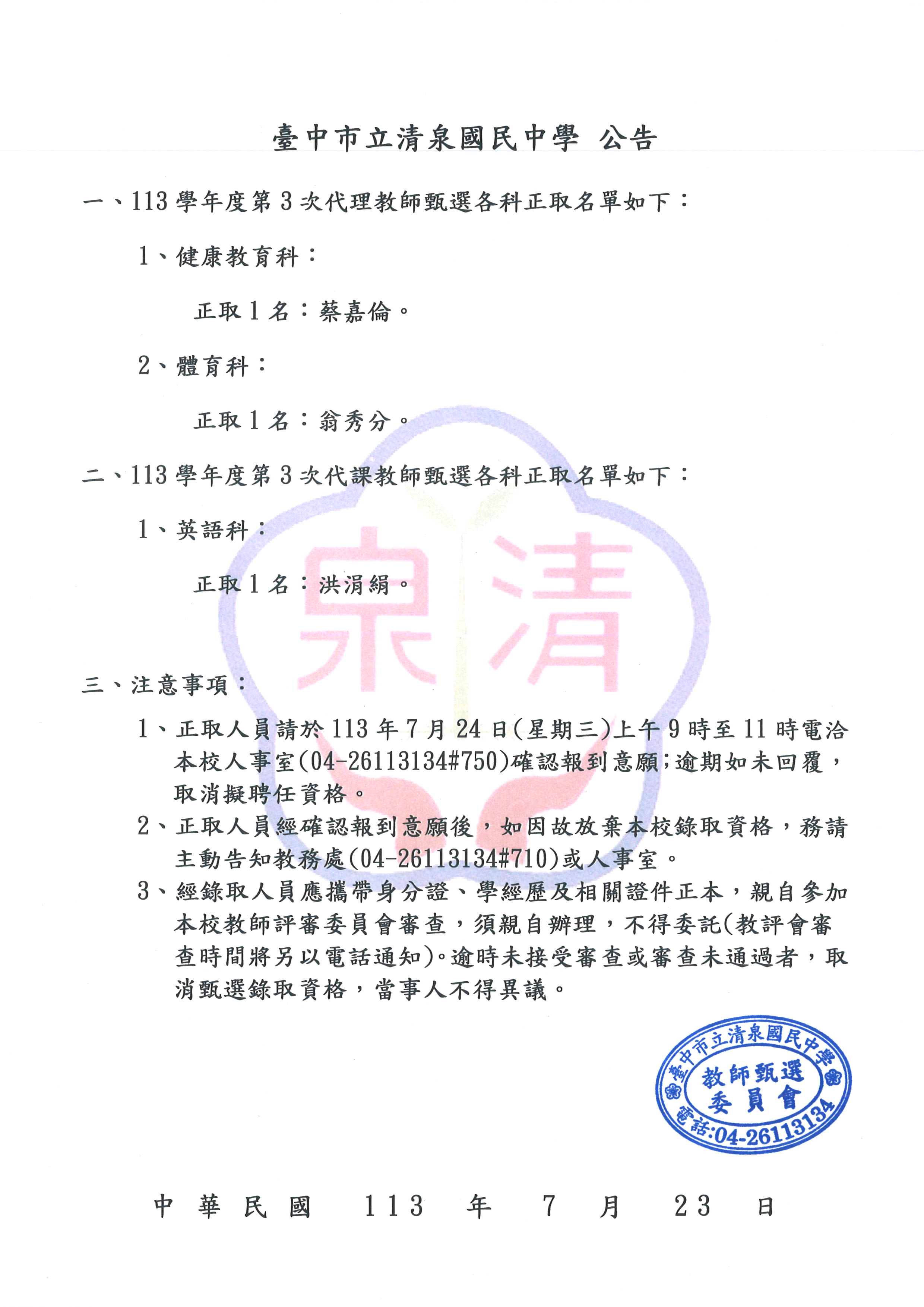 113學年度臺中市立清泉國民中學第3次代理代課教師甄選結果_1130723