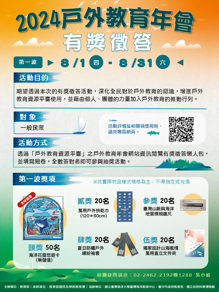 有關教育部辦理「2024戶外教育年會 – 有獎徵答」活動辦法,詳如說明,請查照。