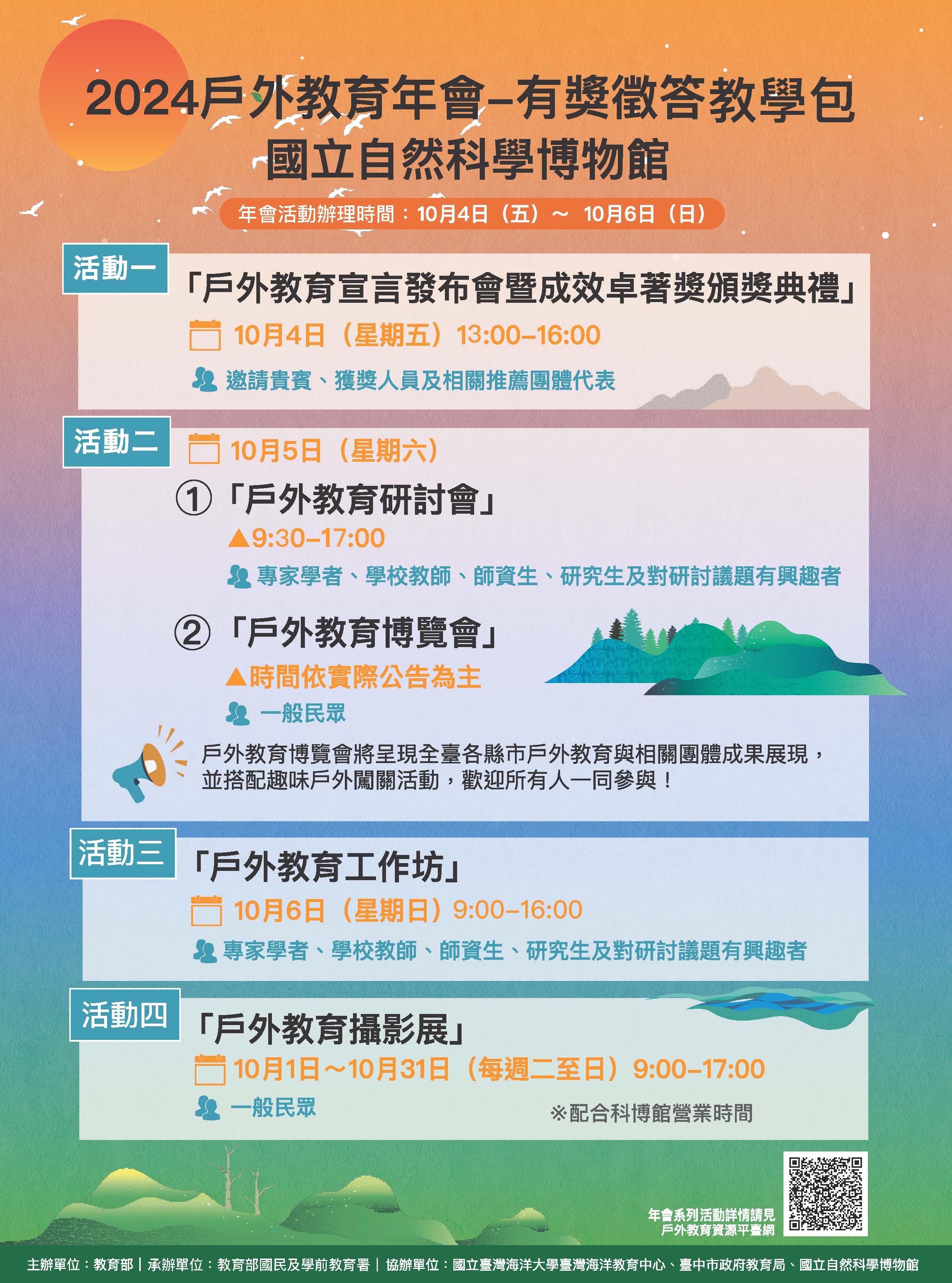 二、2024年為教育部推動戶外教育第10年,為鼓勵大眾加入戶外教育推動行列,於113年10月5日(星期六)邀請大眾參與戶外教育博覽會與闖關活動,期望透過本次的有獎徵答活動,深化全民對於戶外教育的認識,且增進戶外教育資源平臺資源使用,並藉由個人、團體的力量加入戶外教育的推動行列。