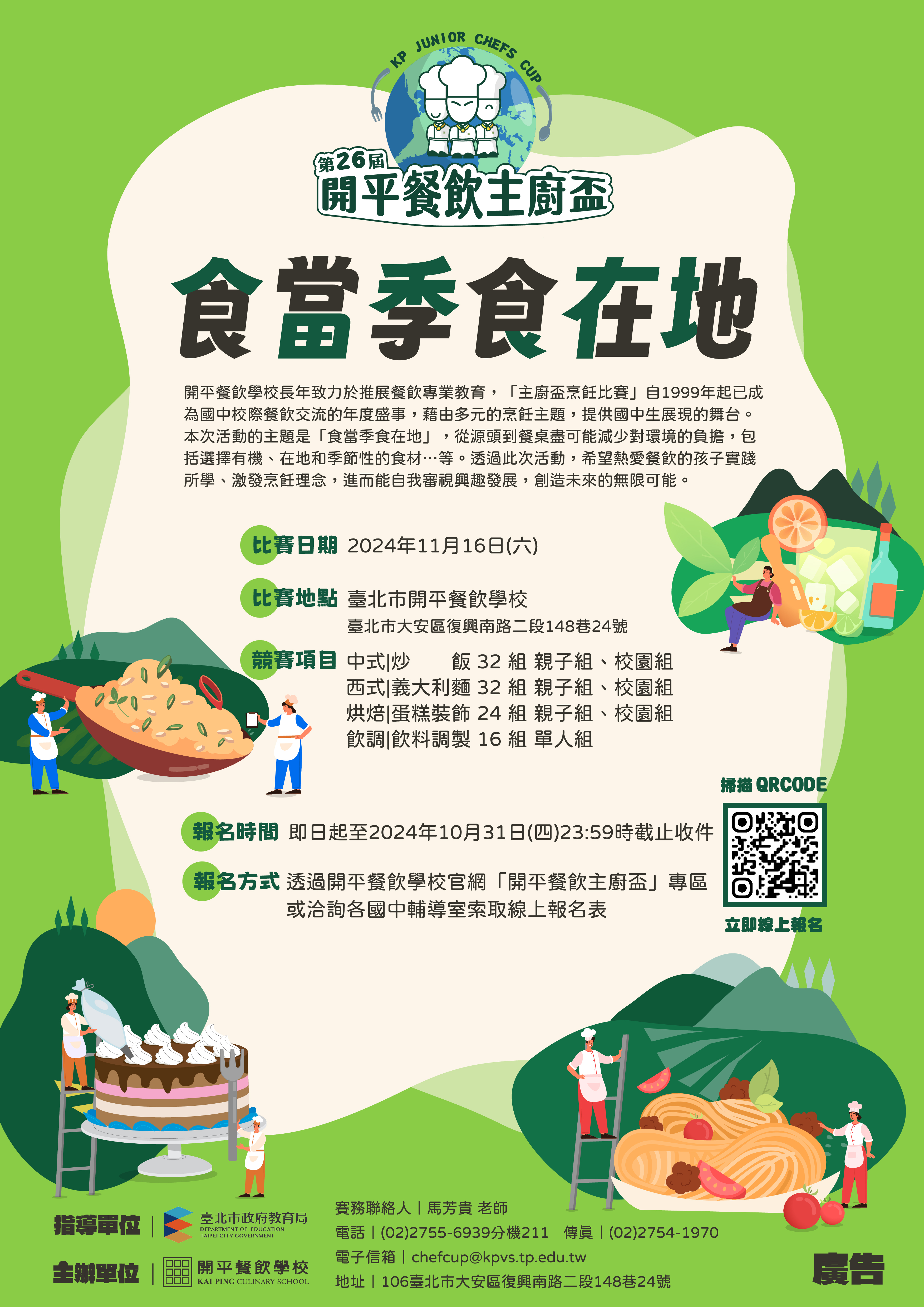 5.詳細比賽資訊請參閱第26屆開平餐飲主廚盃網頁(https://sites.google.com/kpvs.tp.edu.tw/kpvsjcc)或逕洽聯絡人:馬老師,連絡電話:02-2755-6939轉211。