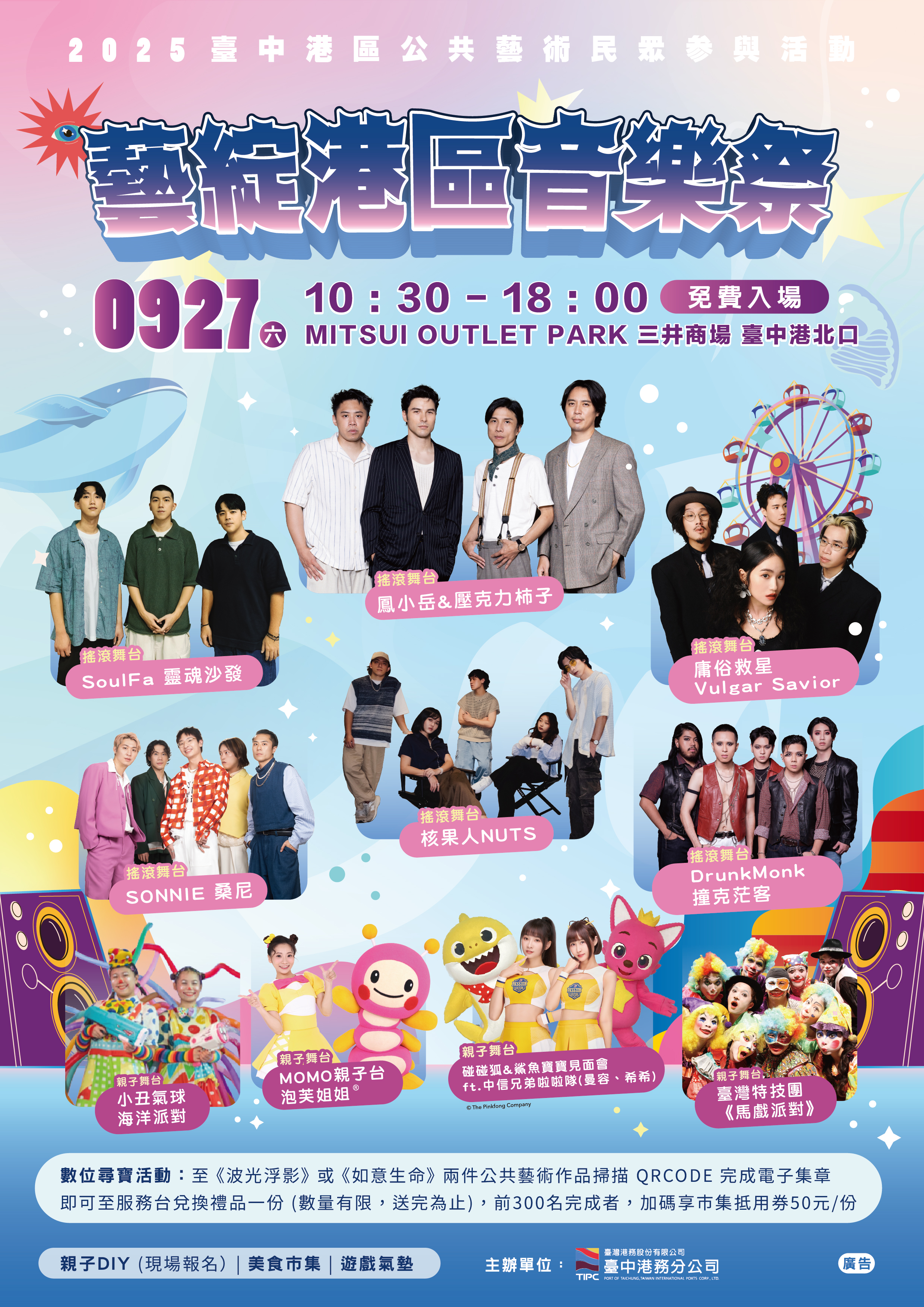 轉知臺灣港務股份有限公司臺中港務分公司辦理「2025臺中港區公共藝術民眾參與活動-藝綻港區音樂祭」活動訊息,請查照。