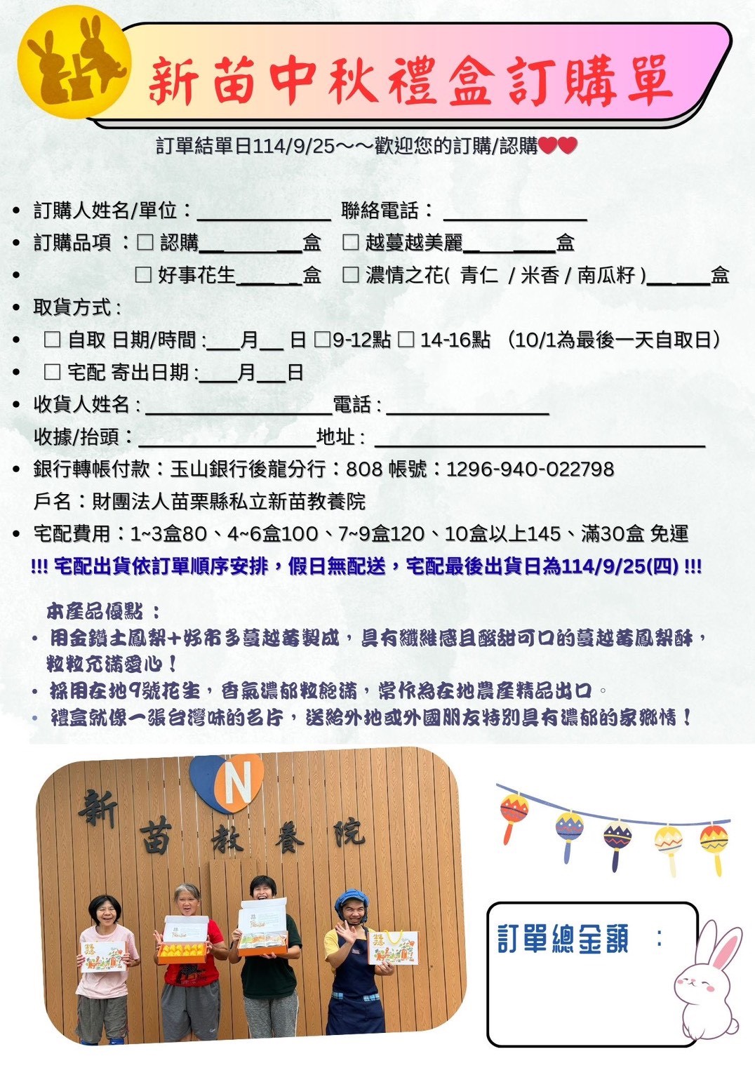 四、檢附苗栗縣優先採購身心障礙福利機構團體或庇護工場生產物品、服務及中秋節禮盒訂購單張各1份,請逕洽各機構團體、庇護工場或至「衛生福利部優先採購網路資訊平台」(https://gov.tw/evs)瀏覽選購。