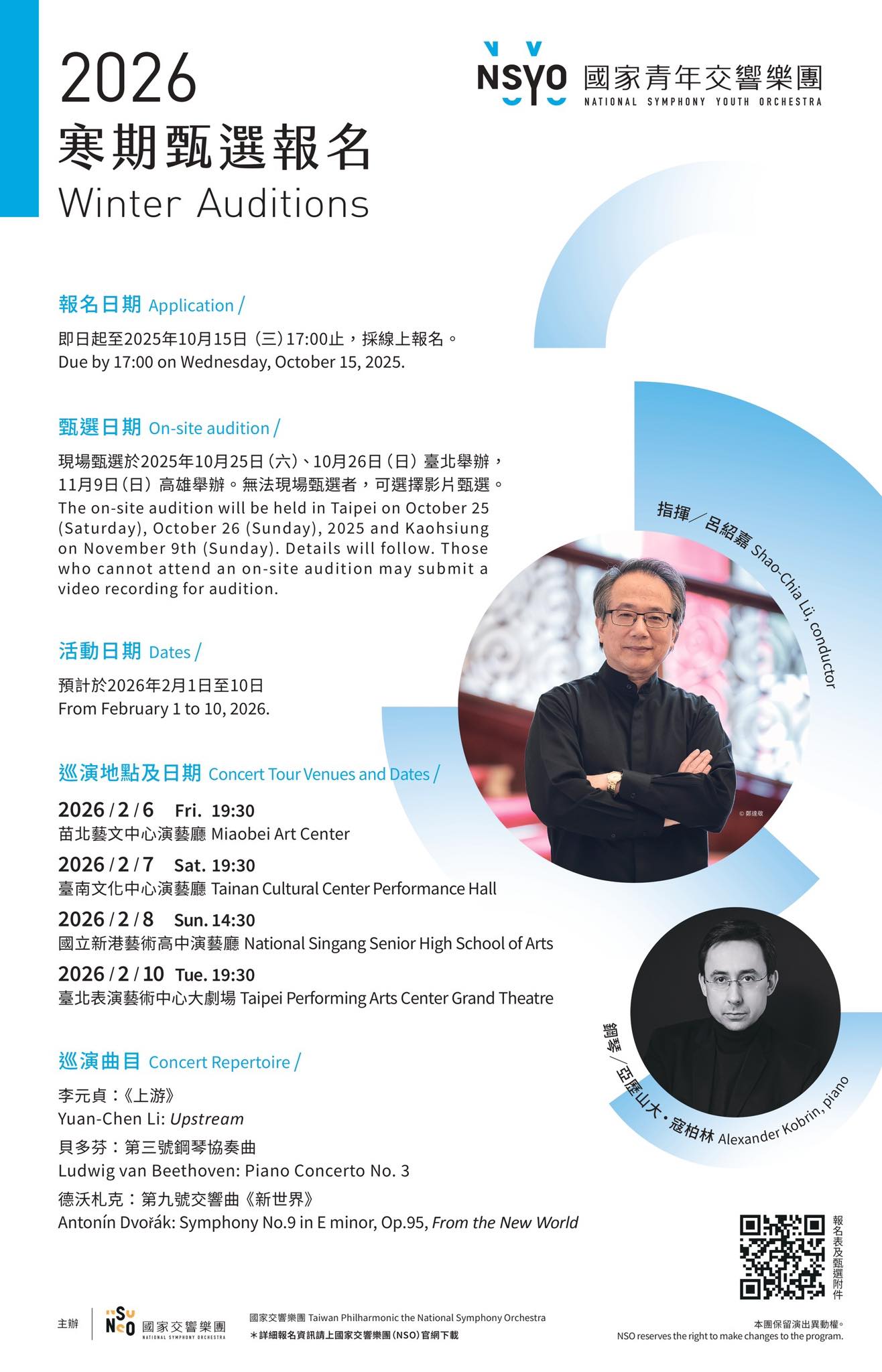 轉知國家表演藝術中心所屬國立臺灣交響樂團舉辦之「2026年國家青年交響樂團寒期活動」,請查照。