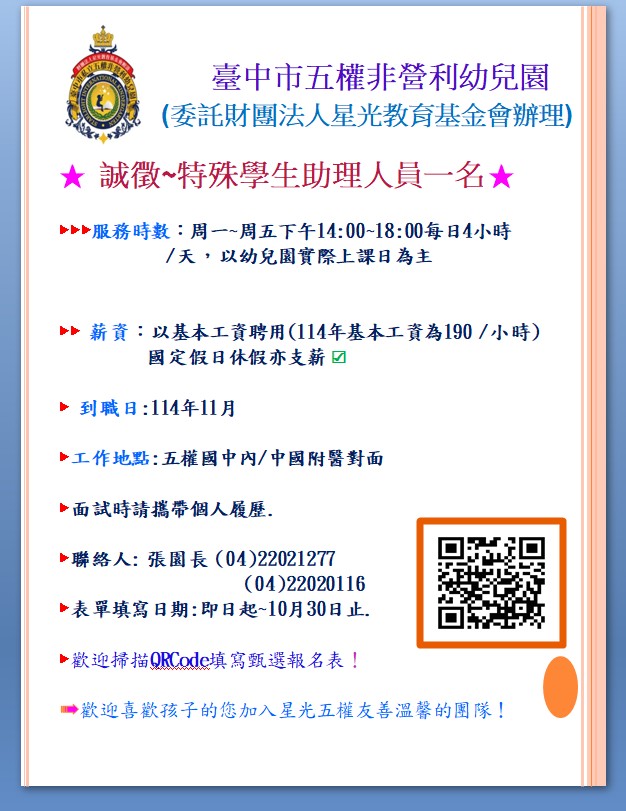 臺中市五權非營利幼兒園徵 (下午時段) 特殊學生助理人員1名