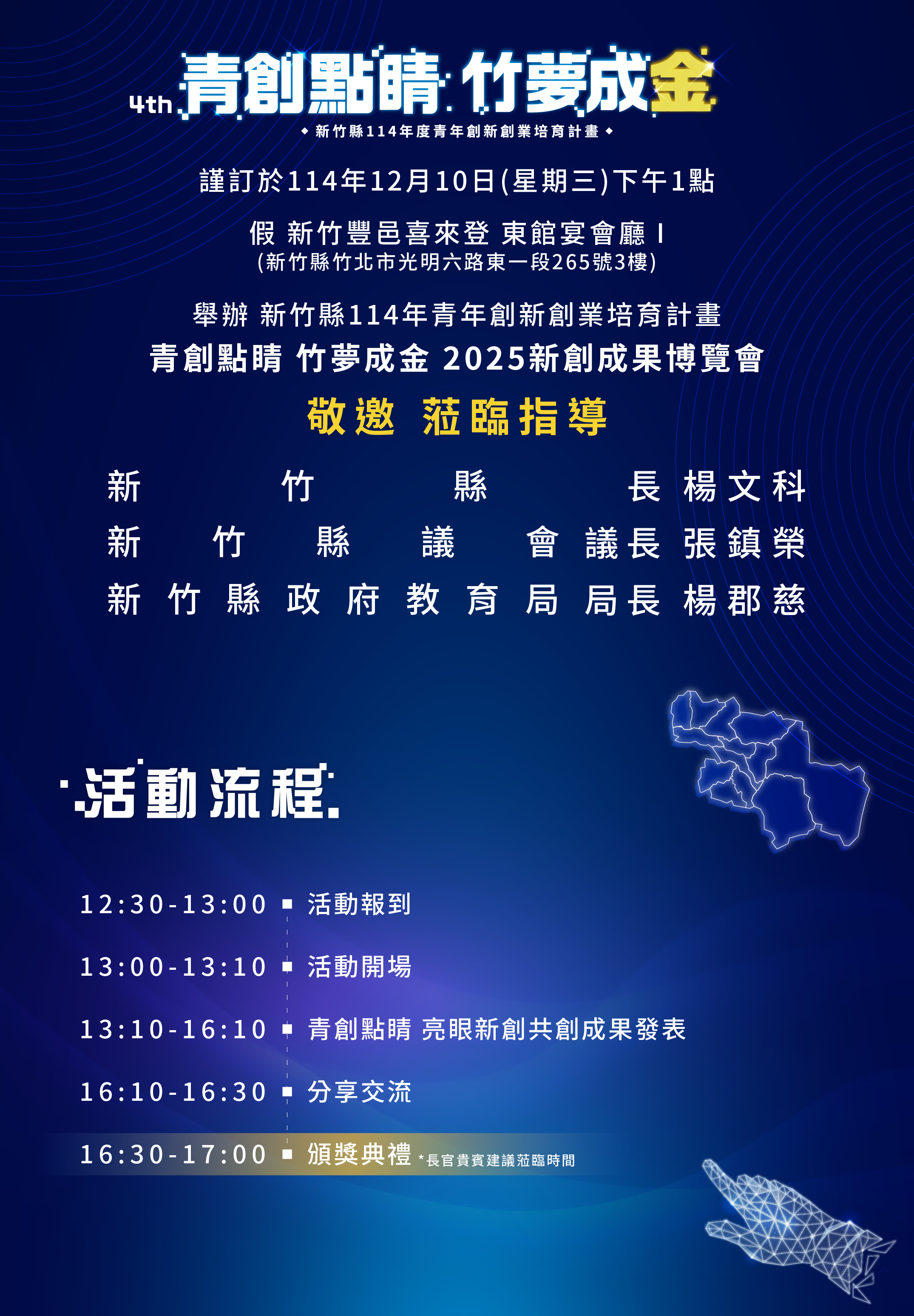 轉知新⽵縣政府教育局辦理「青創點睛 竹夢成金 2025新創成果博覽會」報名資訊,請查照。