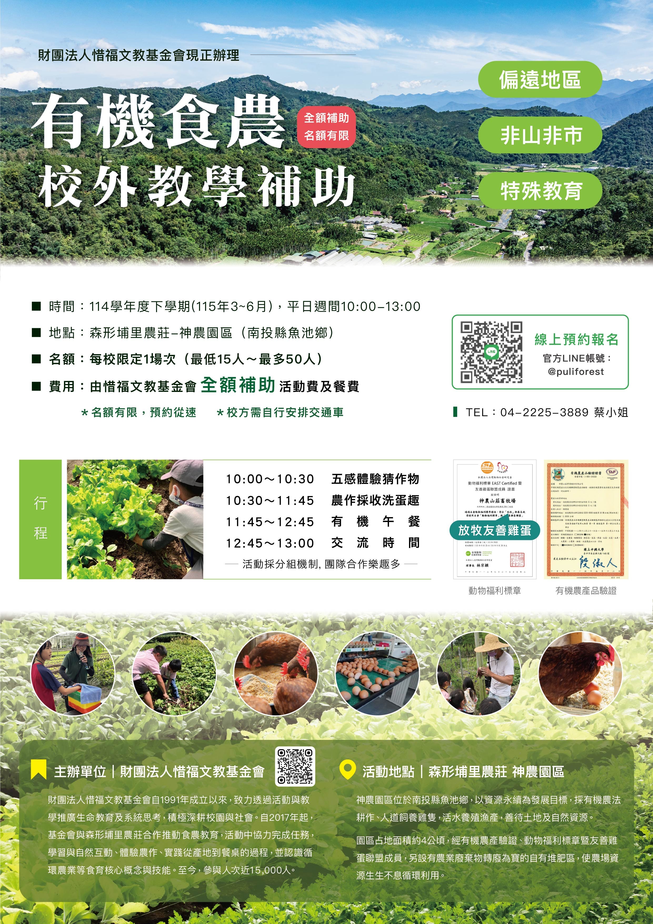 轉知財團法人惜福文教基金會(以下稱該會)辦理偏遠地區、非山非市、特殊教育學校「有機食農-校外教學補助」事宜,詳如說明,請查照。