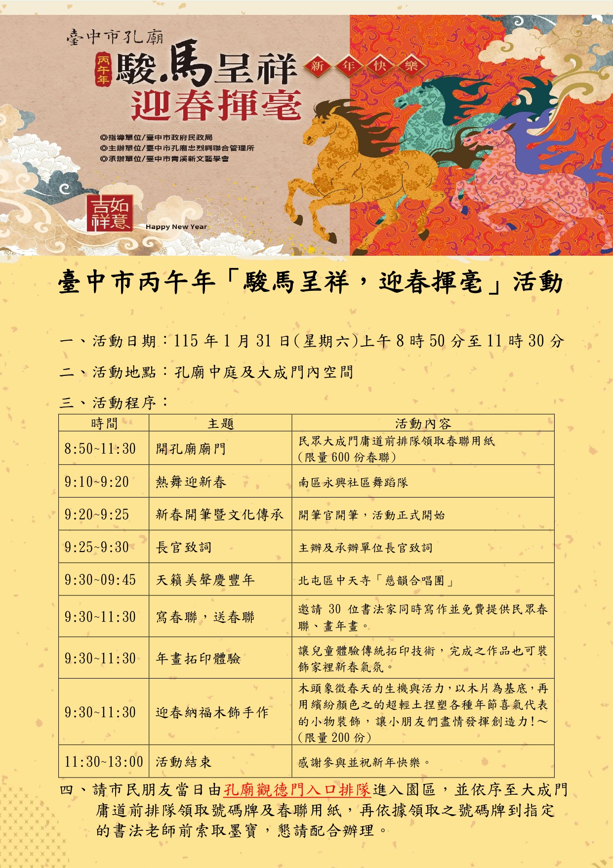 一、依據本市孔廟忠烈祠聯合管理所(以下簡稱該所)115年1月21日孔忠合字第1150000160號函辦理。 二、活動日期及地點: (一) 活動日期:115年1月31日(星期六)上午8時50分至11時30分止。 (二) 活動地點:孔廟中庭及大成門內空間。 三、檢附宣傳海報及活動程序表各1份。 四、如有其他疑問,請逕洽該所幹事曾小姐,電話(04)2233-2264#16。