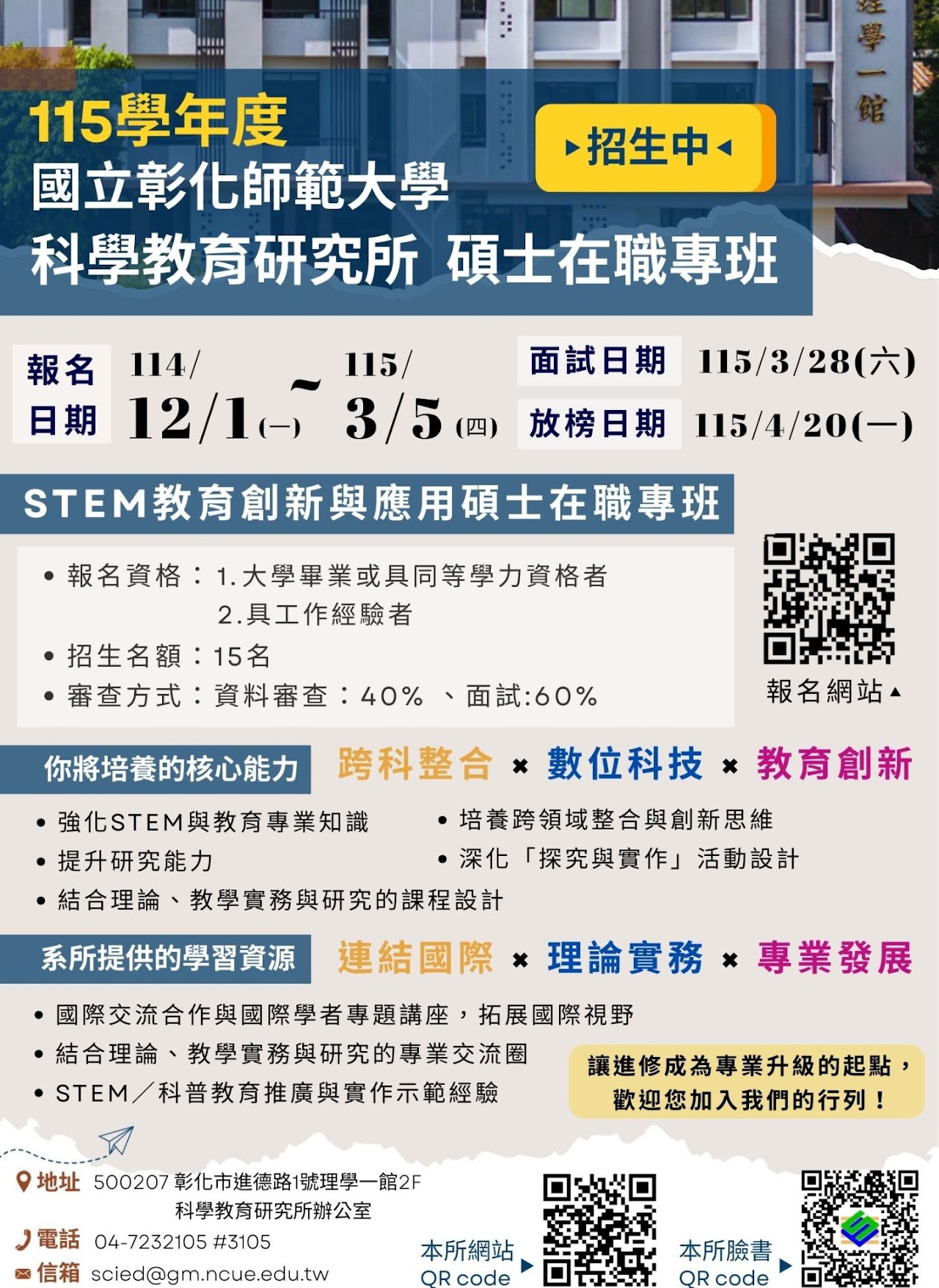 轉知國立彰化師範大學為辦理科學教育研究所115學年度STEM教育創新與應用碩士在職專班(夜間班)招生訊息,請查照。