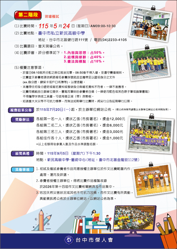 轉知台中巿傑人會「2026年第十四屆傑人盃作文比賽」資訊,請查照。