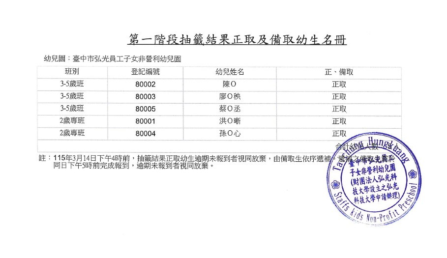 臺中市弘光員工子女非營利幼兒園115學年度第一階段正取名單公告