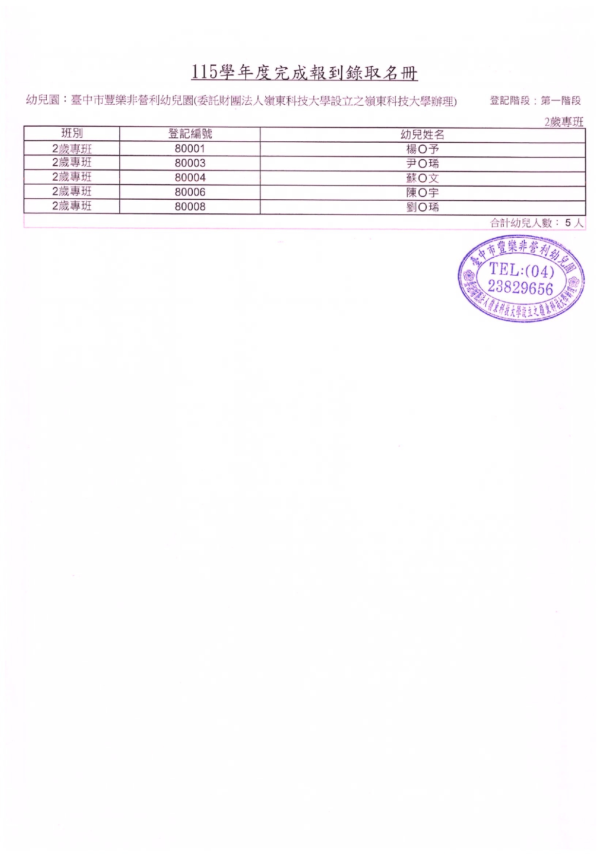 臺中市豐樂非營利幼兒園(委託財團法人嶺東科技大學設立之嶺東科技大學辦理)115學年度第一階段完成報到錄取名冊公告