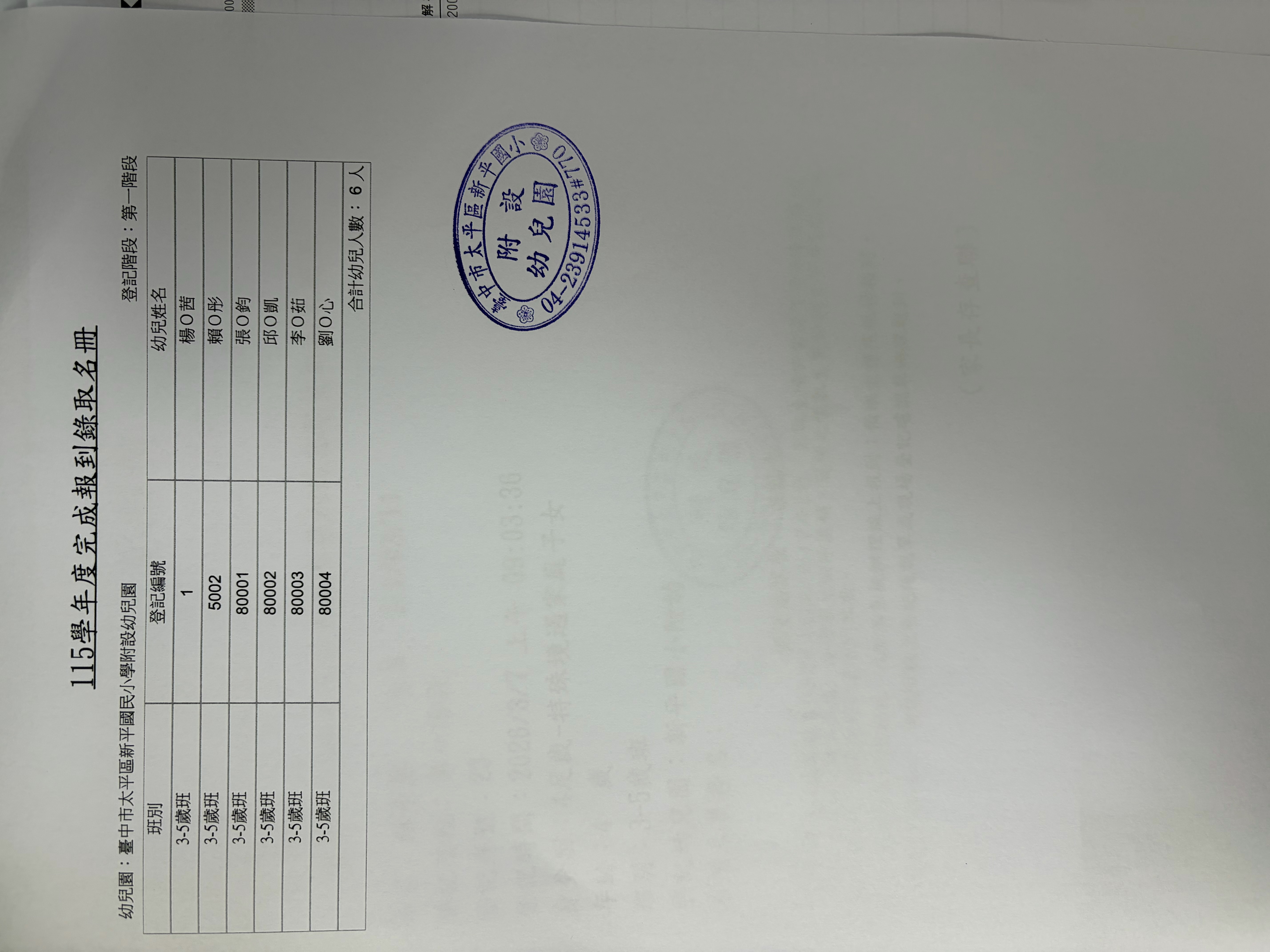 新平附幼115學年度第一階段完成報到錄取結果