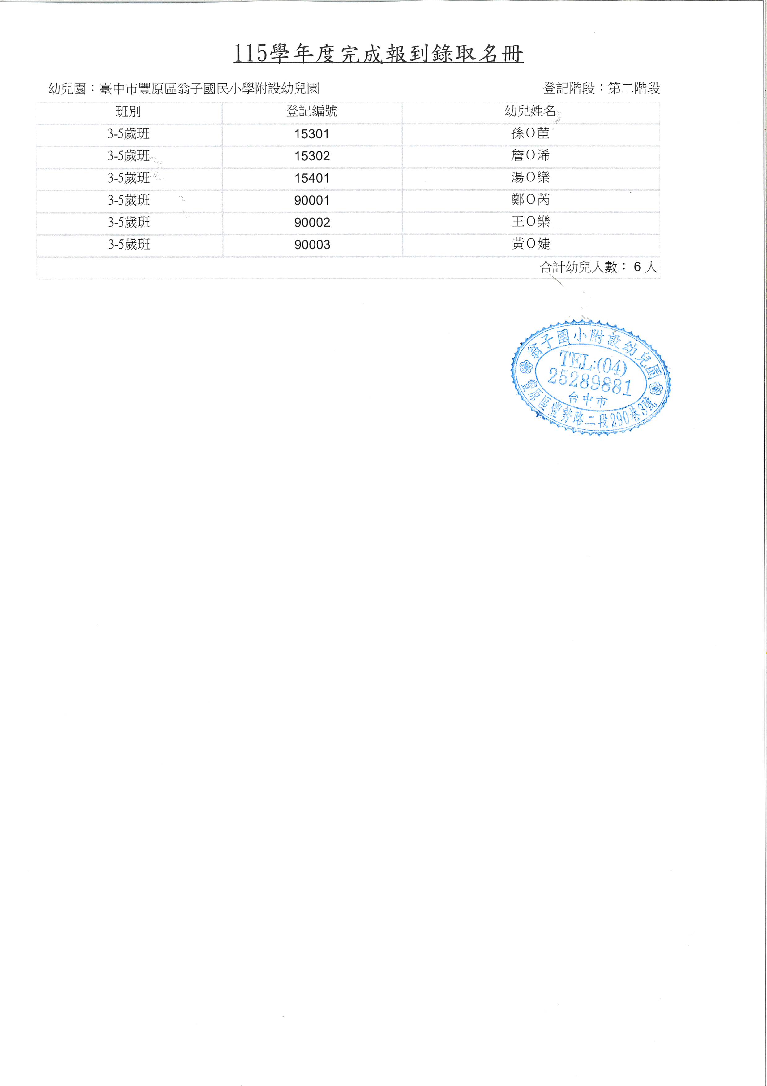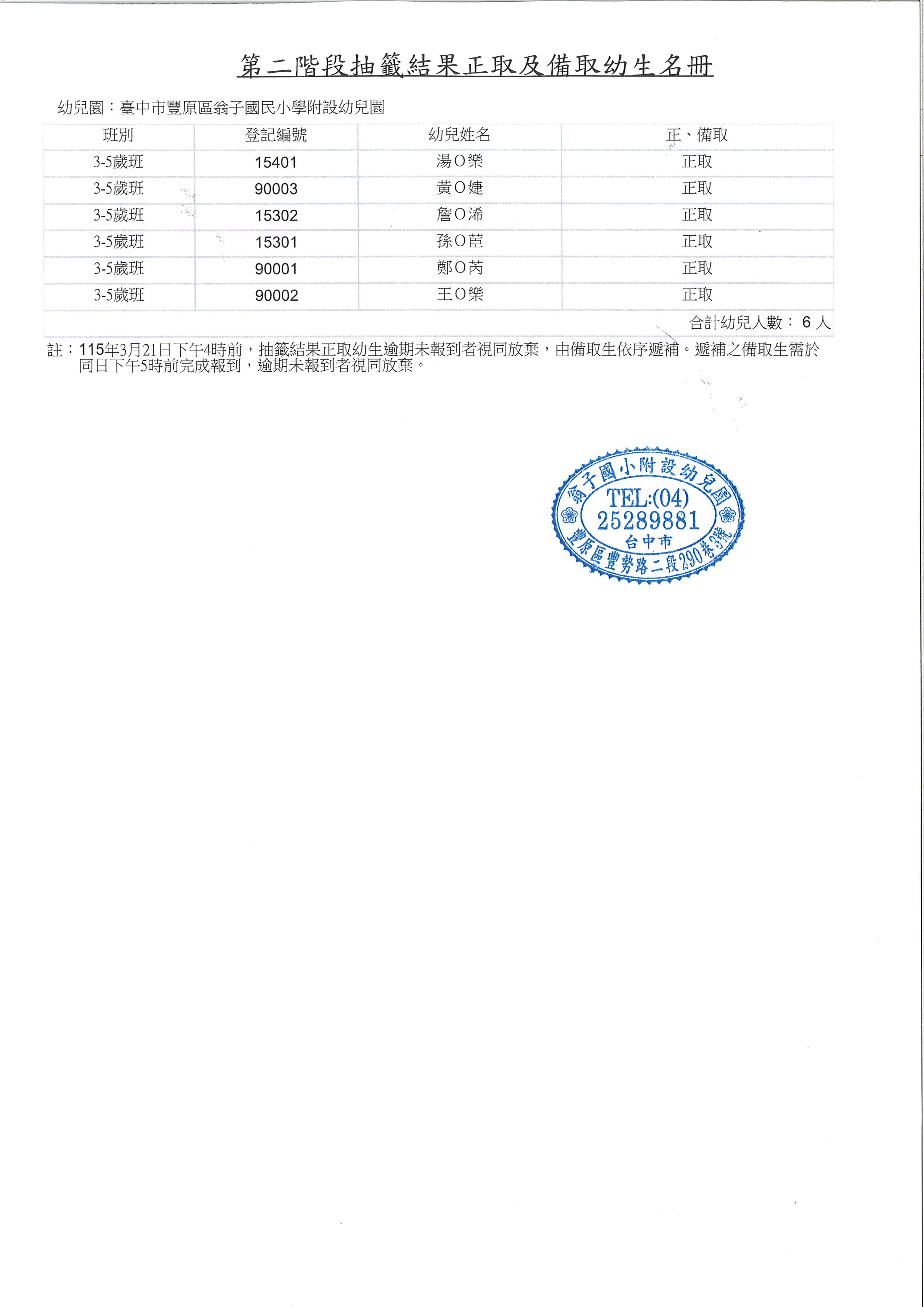 臺中市豐原區翁子國民小學附設幼兒園115學年度第二階段抽籤結果正取及備取幼生名冊