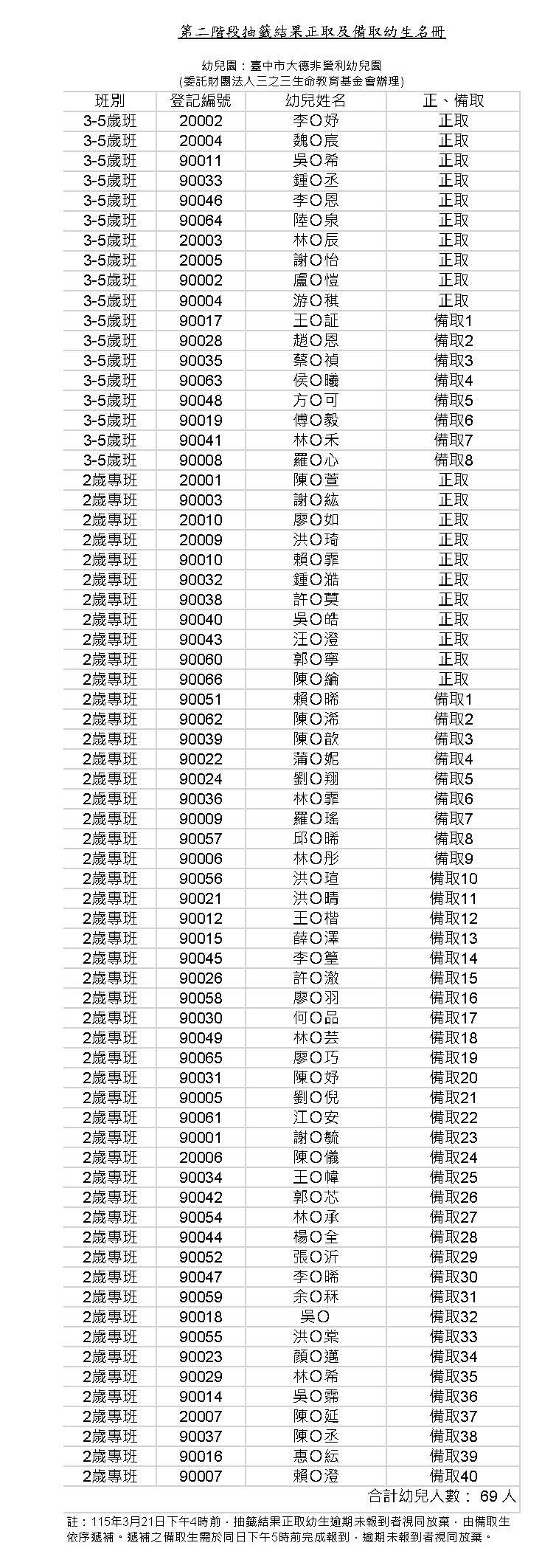 臺中市大德非營利幼兒園(委託財團法人三之三生命教育基金會辦理)115學年度第二階段抽籤正備取名冊與已完成報到名冊公告