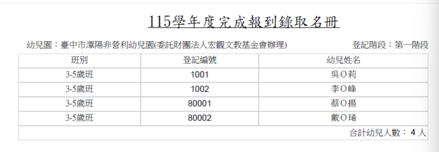 115學年度潭陽非營利幼兒園第一階段招生錄取報到公告