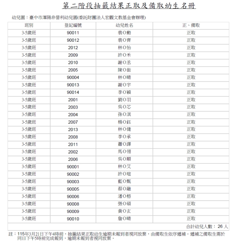 115學年度潭陽非營利幼兒園第二階段招生正備取生名冊公告