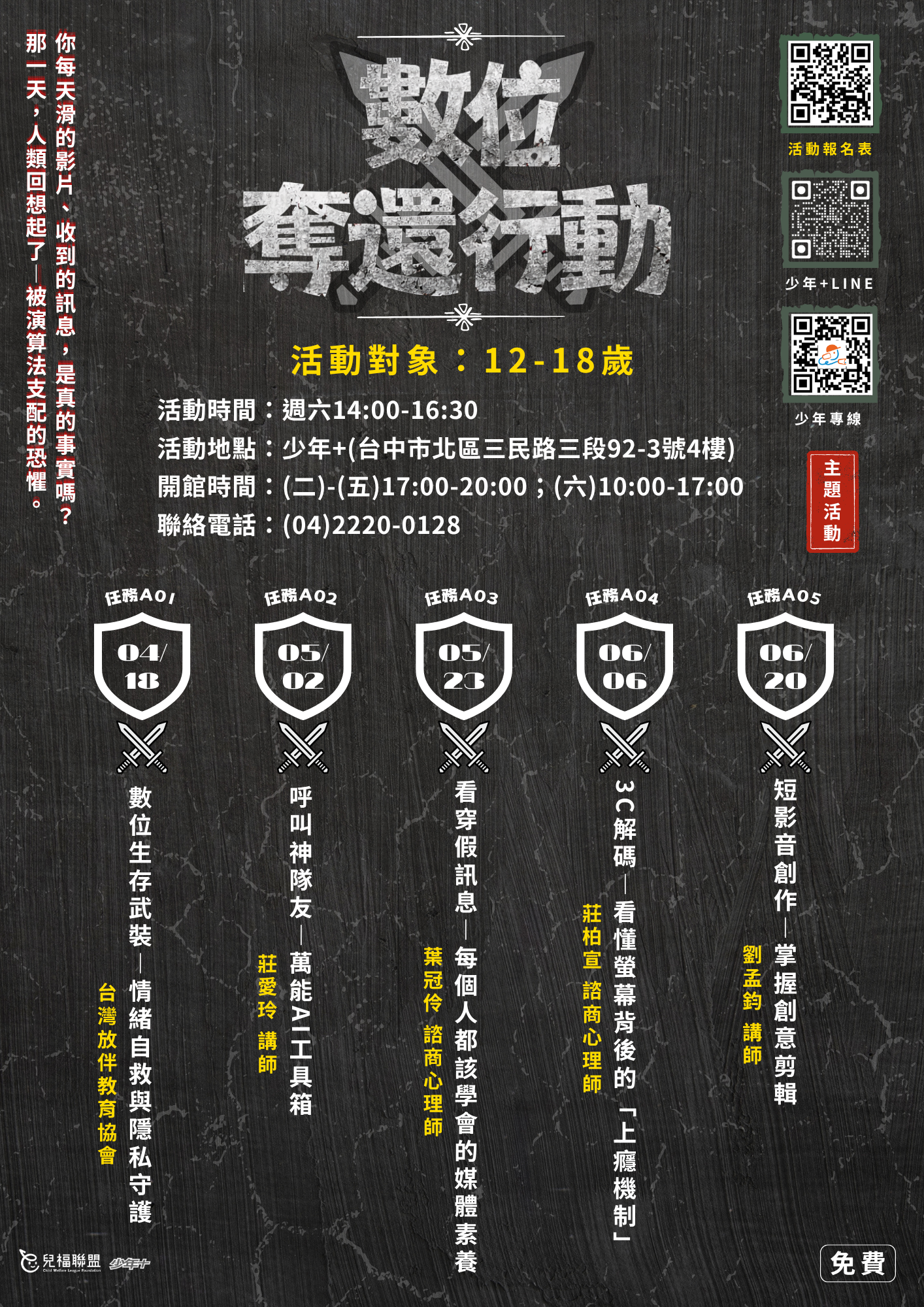 二.本期活動規劃「數位奪還行動-數位培力主題活動及星光小聚」,協助少年探索未來方向及增加正向人際互動經驗,培養學員媒體素養與數位應用能力。