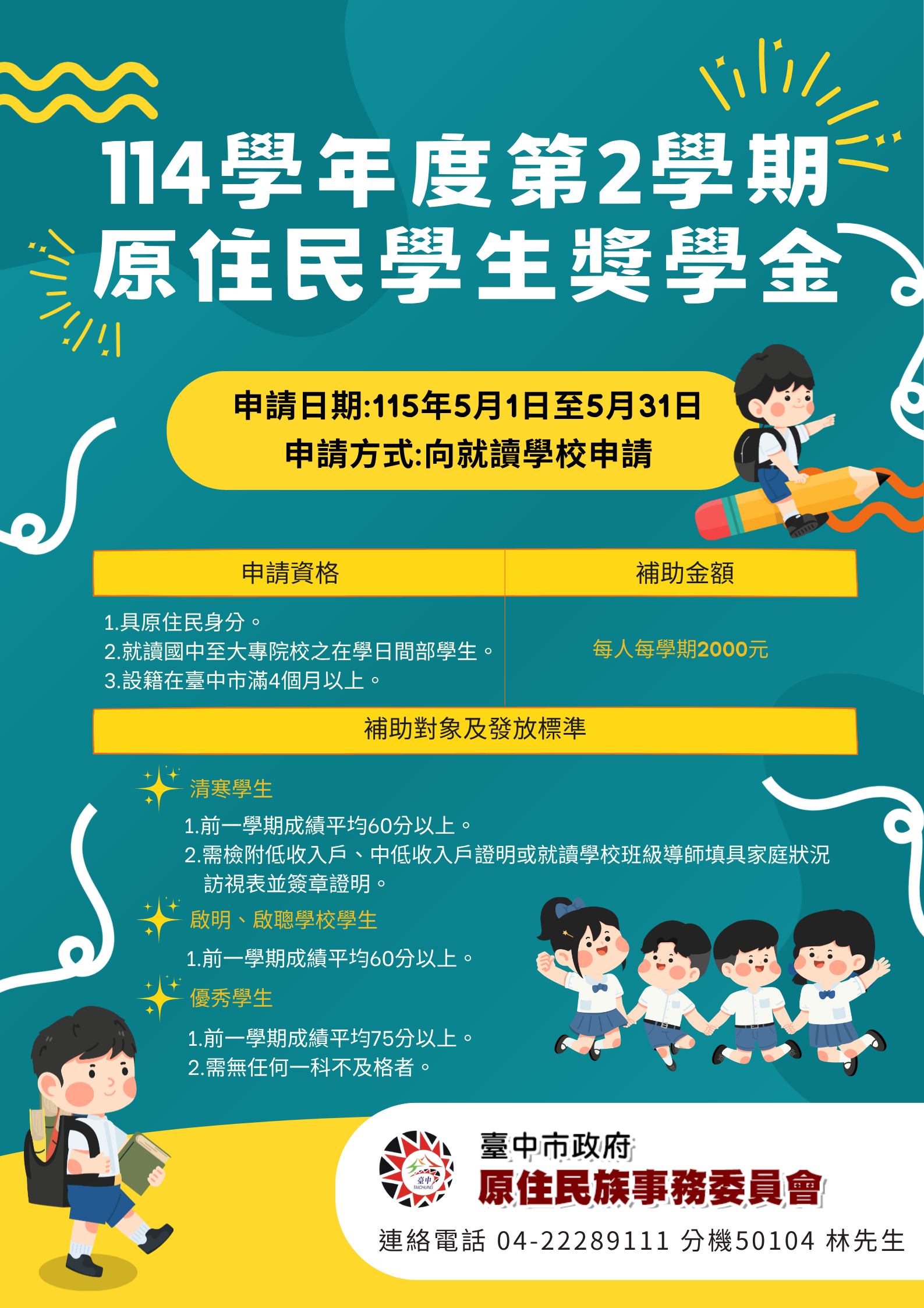 一、依據本府原住民族事務委員會115年4月1日中市原文字第1150003526號函及「臺中市政府原住民族事務委員會辦理原住民學生獎學金發放作業要點」辦理。