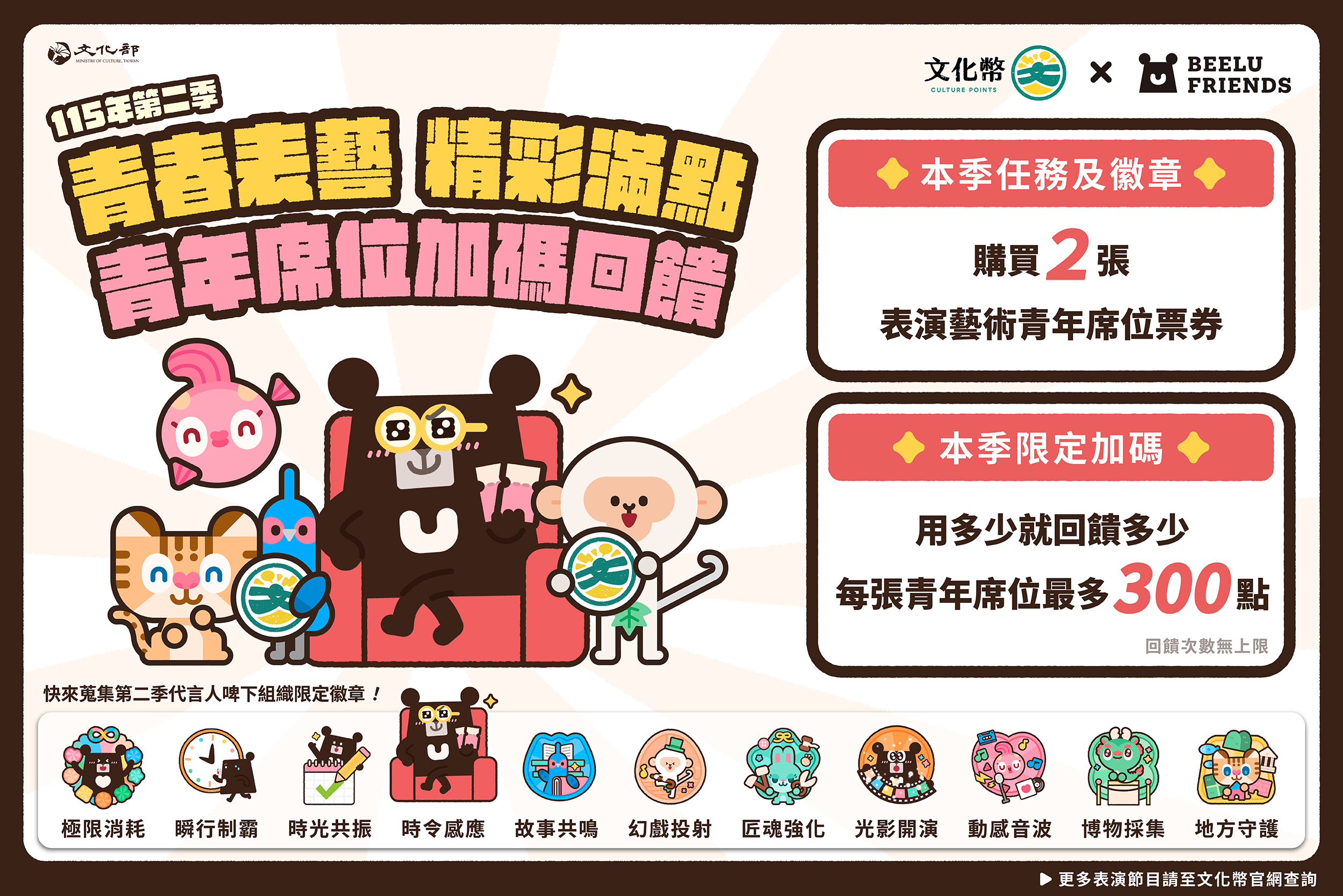 三、為培育藝文消費人口,本市結合所轄場館推出專屬表演藝術限量優惠青年席位,更多詳細資訊可至文化幣官網https://twcp.moc.gov.tw/prec-u/查詢。