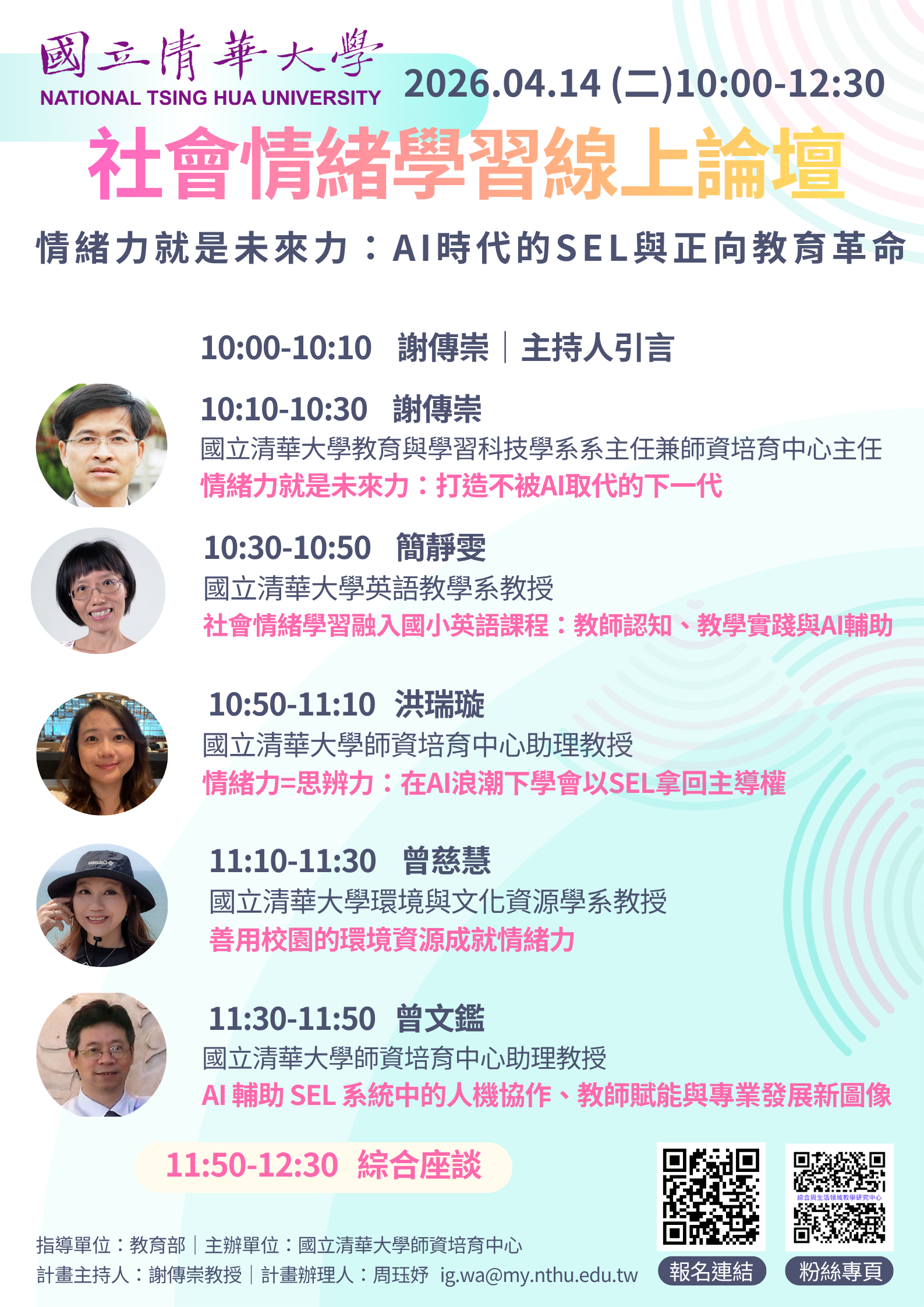 轉知清華大學師資培育中心辦理「情緒力就是未來力:AI時代的SEL與正向教育革命」線上論壇,請查照。