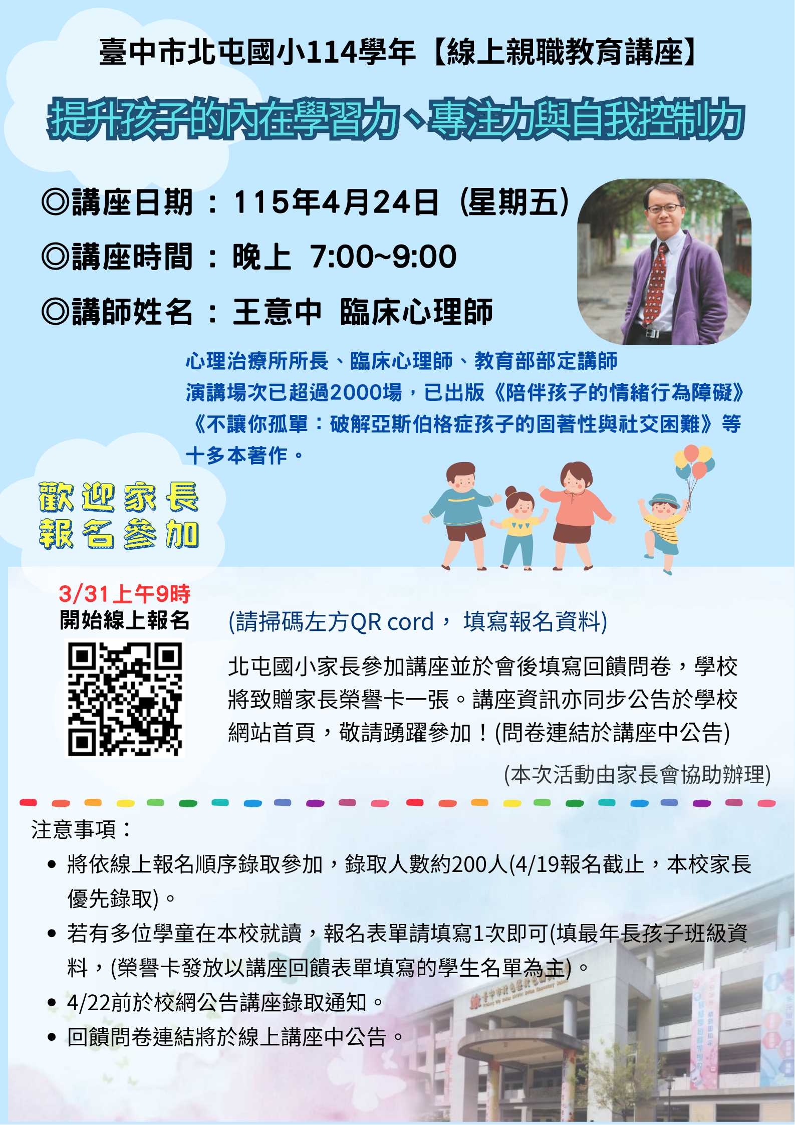 臺中市北屯國小辦理線上親職講座,歡迎家長一起報名參加。 講師:王意中 心理師 講題:提升孩子的內在學習力、專注力與自我控制力 研習方式:線上親職講座(報名完成後提供線上連結) 時間:115年4月24日星期五晚上7點-9點 報名網址如參考網址