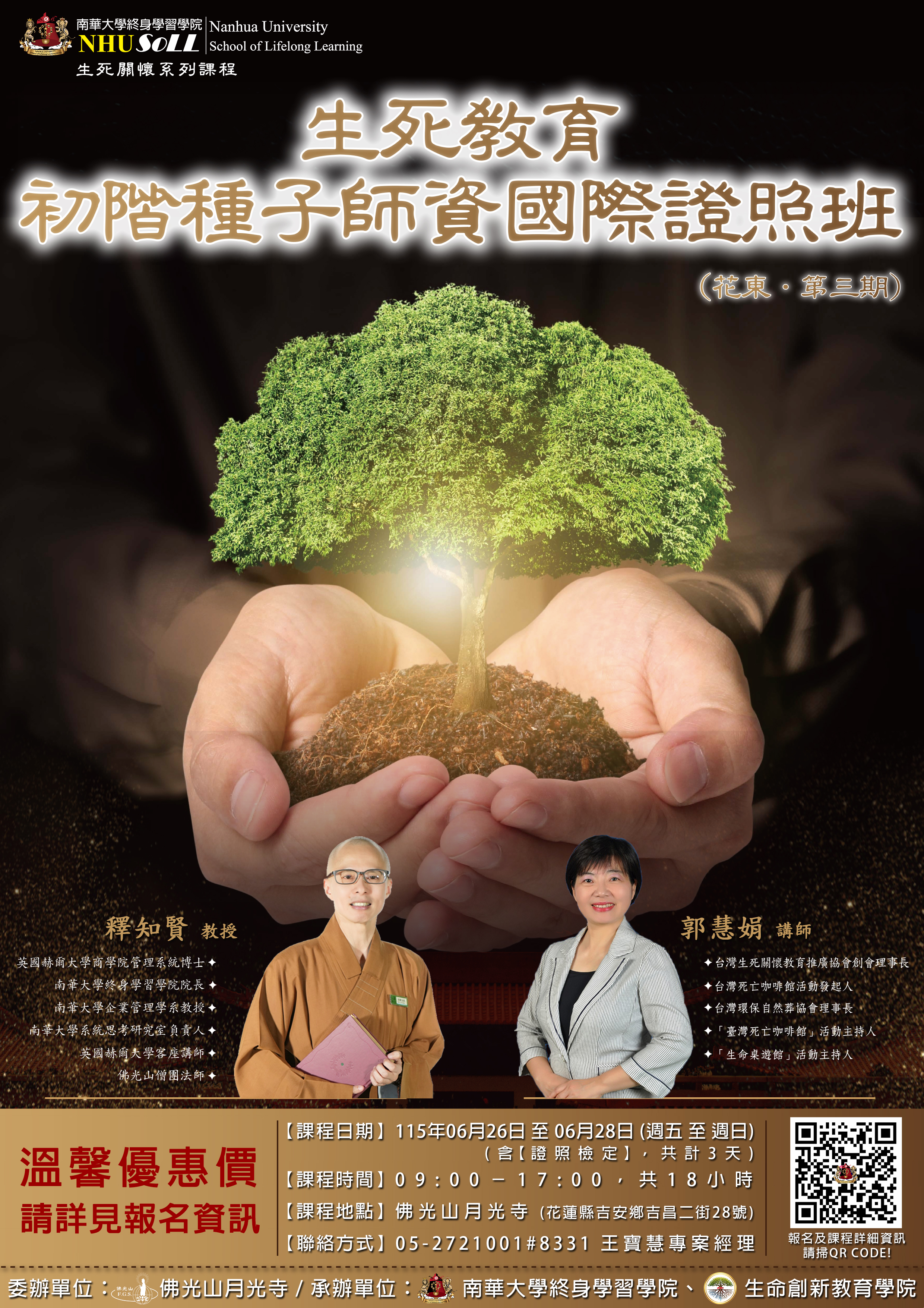 轉知南華大學辦理【生死教育初階種子師資證照班】(花東.第一期),請查參。
