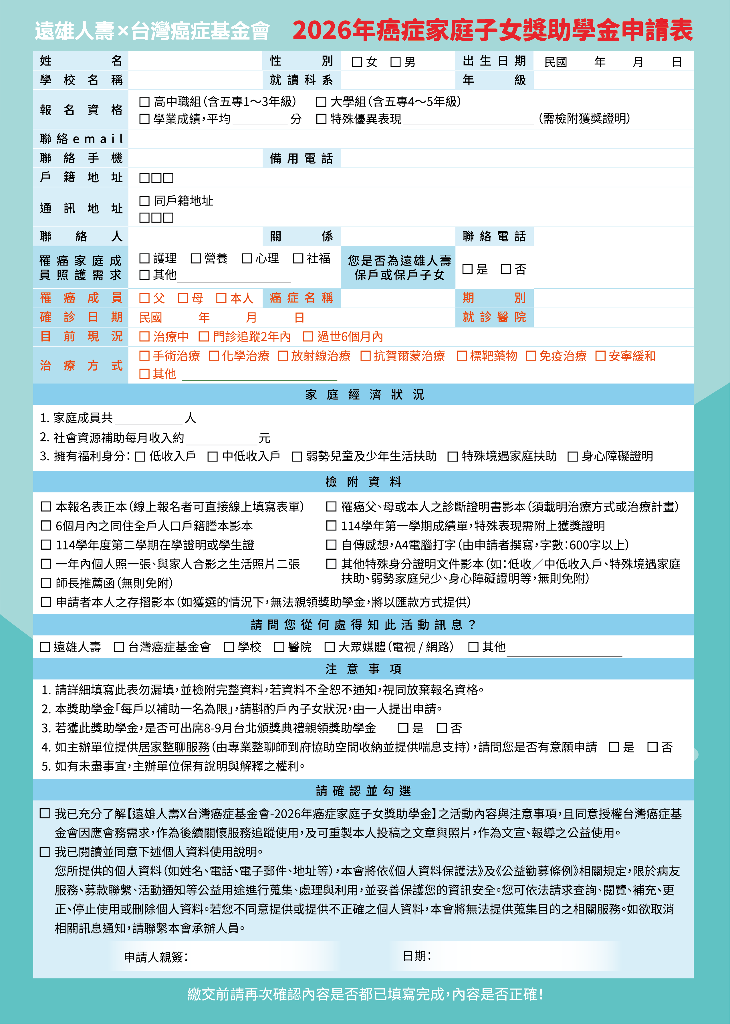 七、檢附「2026台灣癌症基金會x遠雄人壽-癌症家庭子女獎助學金」活動DM。