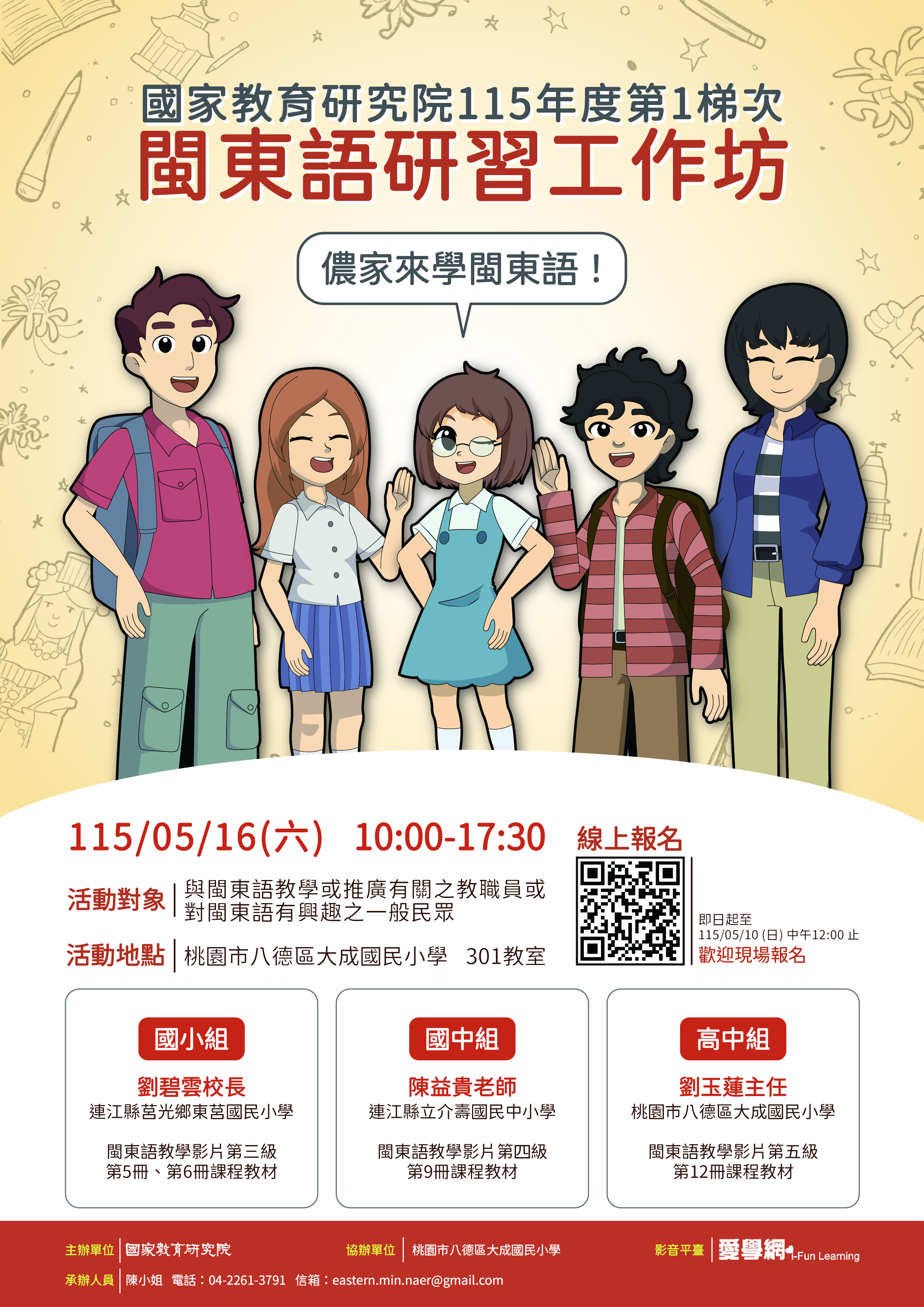 轉知國家教育研究院(下稱國教院)辦理115年第1梯次「閩東語研習工作坊」活動,鼓勵所屬踴躍參與,請查照。