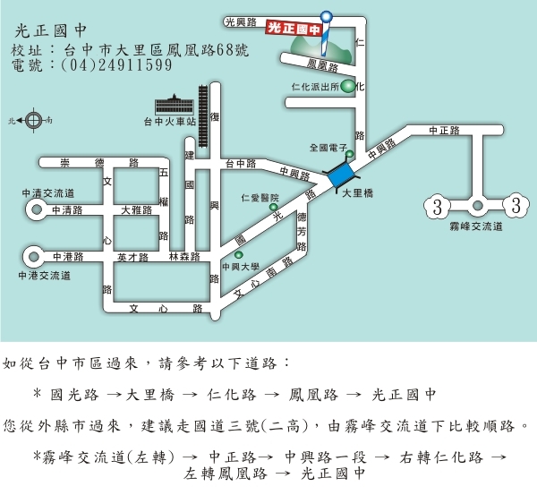 民國九十九年十二月臺中縣市合併,縣立光正國中改制為臺中市立光正國中。