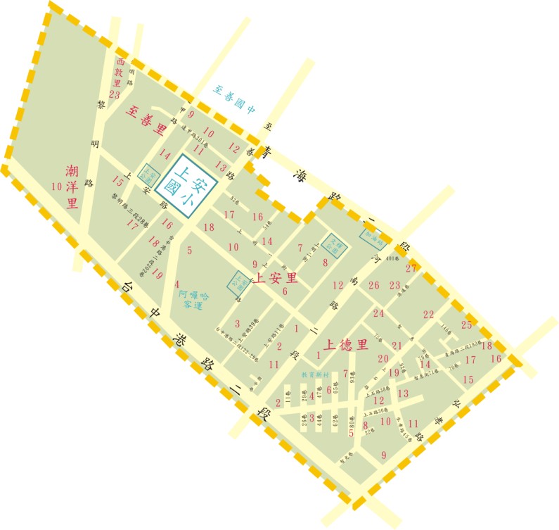 上安里(第1-12、14、16-23鄰、第15鄰:【至善路82巷以西、至善路106巷以南】、【上仁街143~157(奇數)、161~167(奇數)號】)