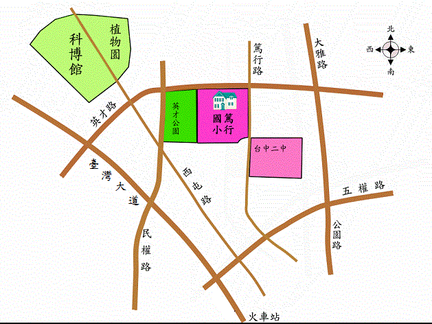 1. 本校位居市區,交通便利,鄰近科博館、植物園、中國醫藥大學及附設醫院、台中教育大學、美術館,並與英才公園相接,和台中二中斜對角。校地3.25公頃面積廣大文化及生態環境佳。