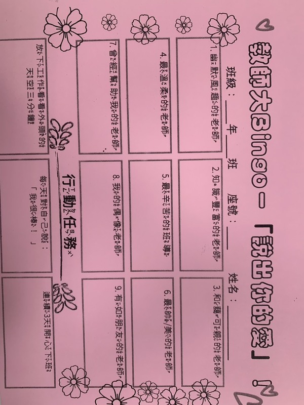 活動當天,校長代表全體家長與志工,將精心準備的敬師禮物獻給教師們,象徵社區與家庭對教師辛勤付出的支持與肯定。隨後舉辦的「教師大賓果」活動更是熱鬧非凡,學生們依提示尋找「最幽默的老師」、「知識最豐富的老師」、「曾經幫助過我的老師」等,並邀請老師簽名,再大聲喊出「教師節快樂!」。
