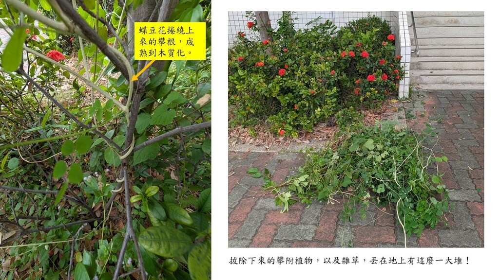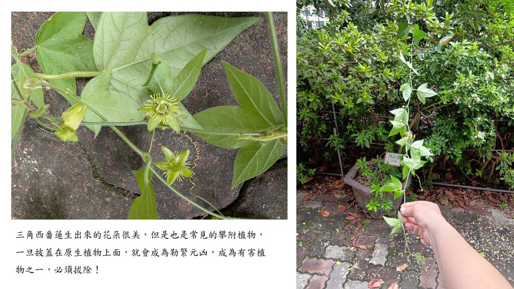 這些外來攀附植物包括蝶豆花、三角西番蓮、日本鐵線蕨、山苦瓜等,它們以驚人的速度蔓延,將原生植物緊緊纏繞,甚至完全覆蓋,導致原生植物無法獲得足夠的陽光與空氣,逐漸枯萎死亡。校園裡的矮仙丹等原生植物首當其衝,成為這些攀附植物的「受害者」。