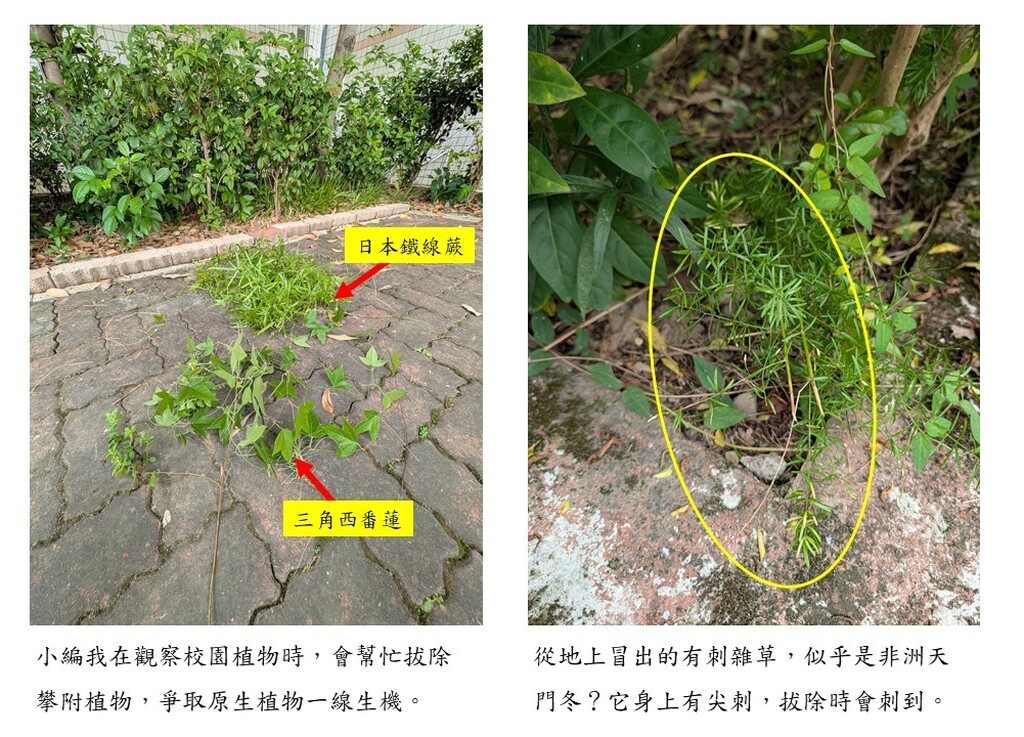 近日天氣不穩定,接連的大雨為校園植物帶來了豐沛的雨量,卻也意外促使了深藏土中的外來攀附植物種子迅速萌芽,讓大勇國小的原生植物面臨被纏繞的危機。