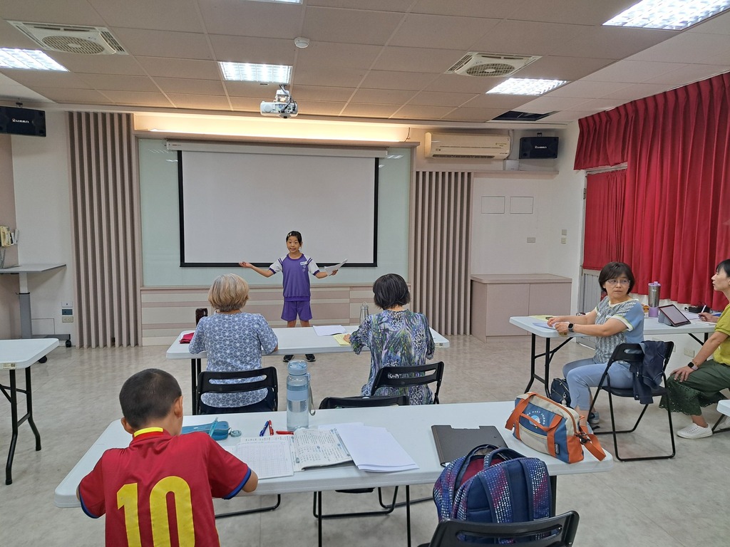 培訓課程於臺中市忠孝國小舉行,現場氣氛專注而熱烈。指導老師從語音咬字、語調情感、肢體語言到演說內容架構,皆進行細緻講解與實際演練。謝巧薇同學在專家悉心指導下,逐句練習,展現專注學習的態度與不懈努力。現場師長與陪同家長也給予鼓勵,期望她能在舞台上完美詮釋客語之美。