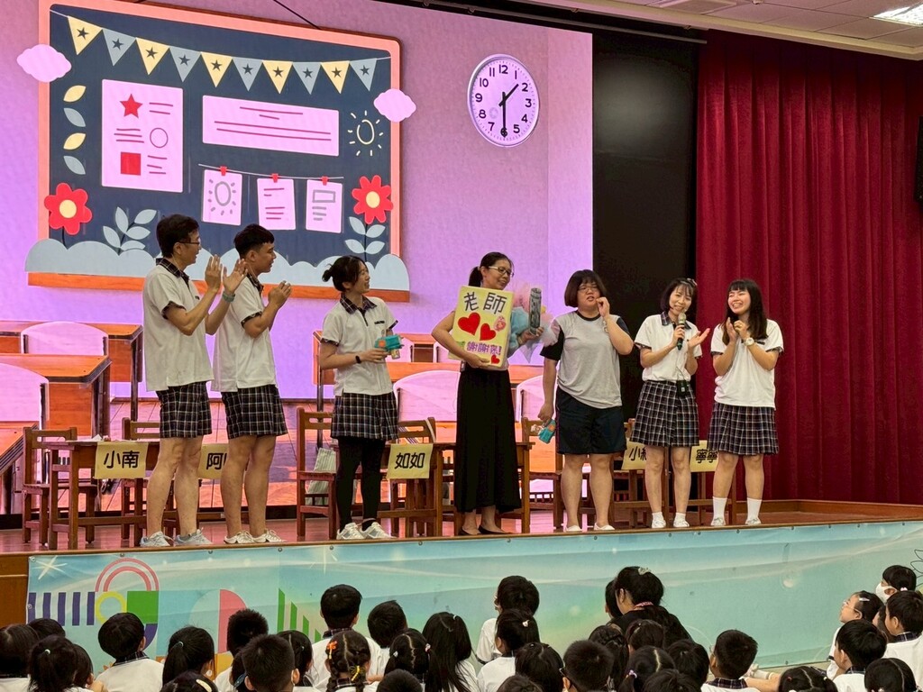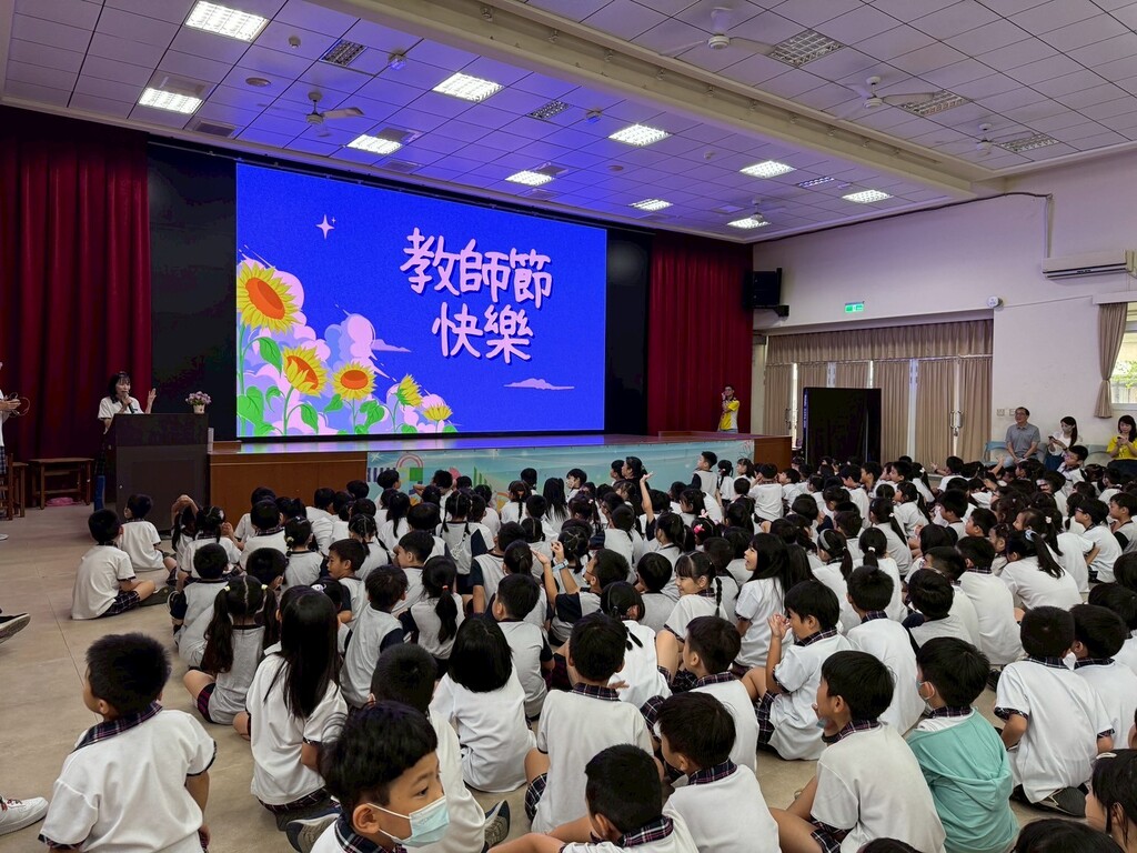 接著登場的是9月26日上午重頭戲「敬師感恩活動」,全校師生集合於藝術展演廳,除了頒發資深優良教師、優良教育人員獎狀外,最受期待的是表演節目。首先由6年1班全班同學進行歌曲演唱:老師最常說的十句話,並且播放學生想對老師說的話影片,現場溫馨感人。接著由輔導室莊老師負責編劇及執導的戲劇-「教師節驚喜」登場,演員是由輔導室老師擔任,劇情曲折離奇、效果十足,最後更引起一波一起感謝教師的高潮,現場也聽到有學生說:「哇!原來教師節就是這樣來的,老師真的很辛苦,我以後要更聽老師的教導。」最後由全校學生合唱「感謝」這首歌曲做溫馨結尾,藉由優美的旋律,傳達給聆聽的師長祝福與溫暖。