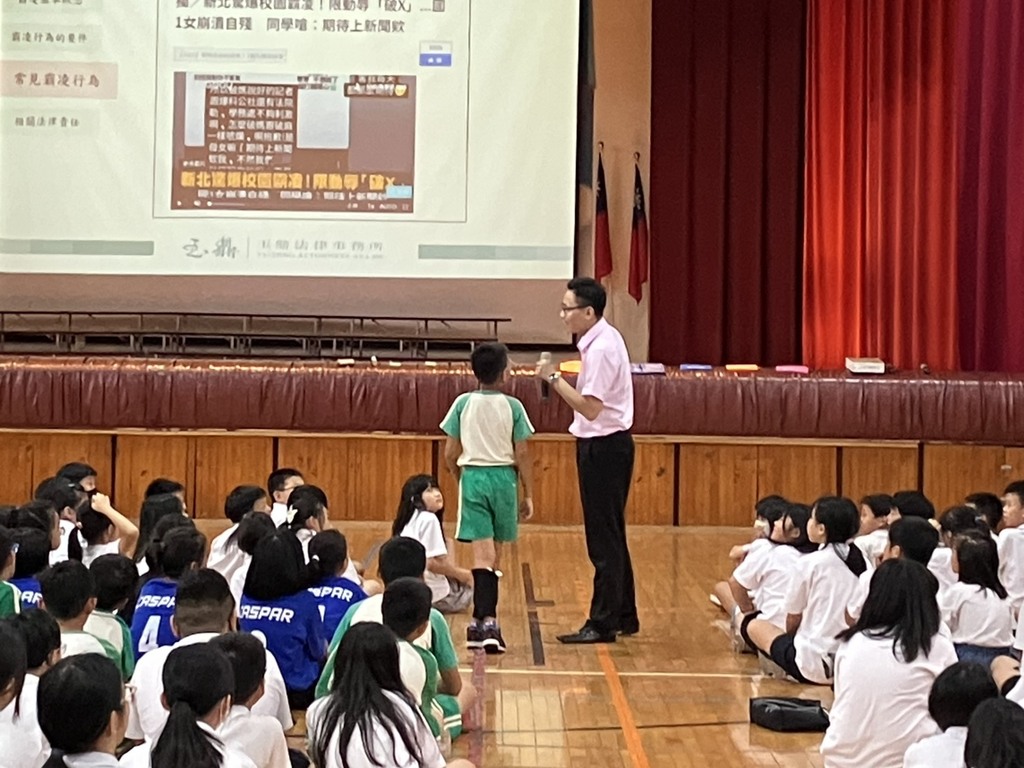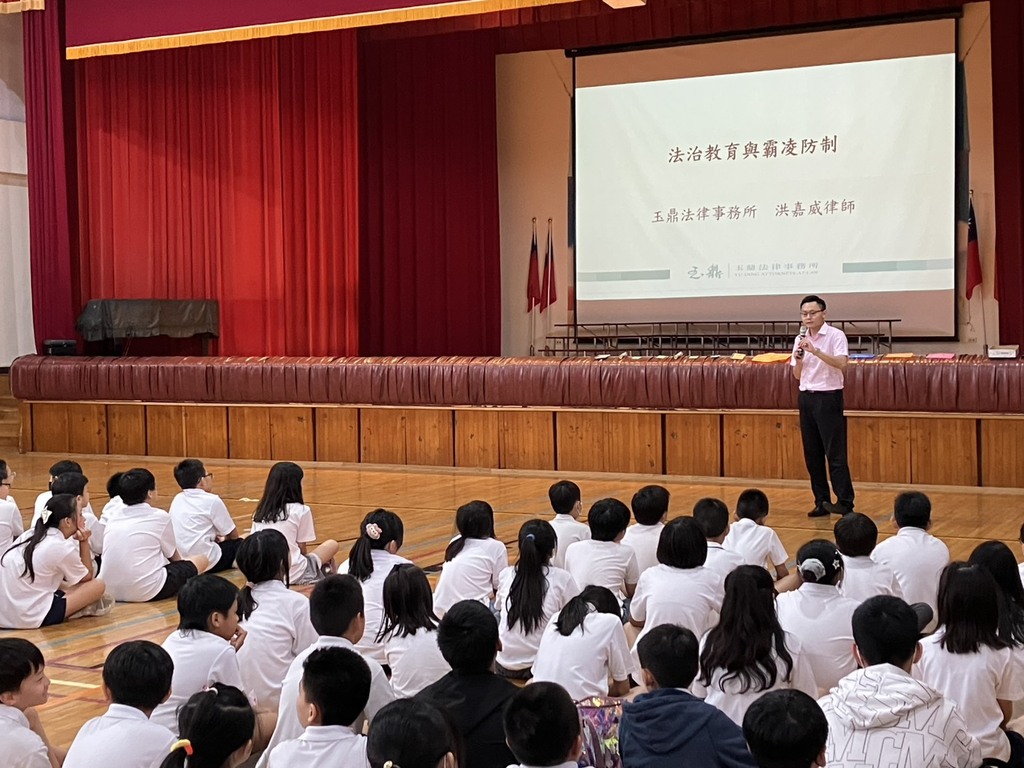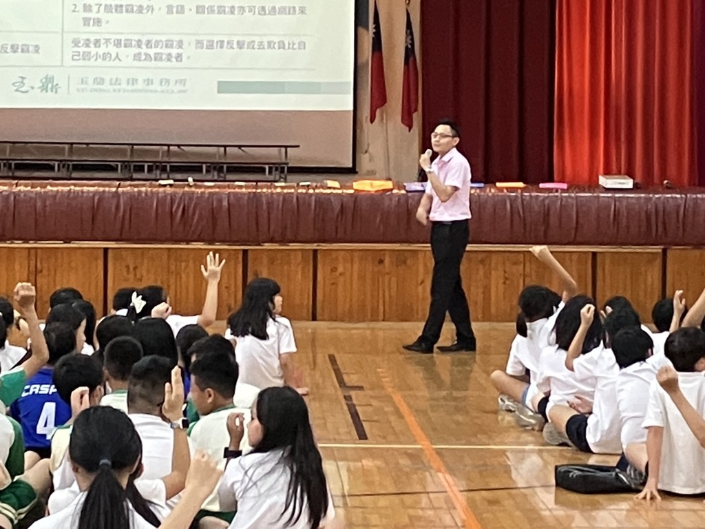 教育局辦理「防制霸凌暨法治教育」邀請專業律師團隊到校宣導,今天蒞臨北屯國小的是洪律師,以實際案例為主輔以法規說明,讓學生知道受到法律的保護,鼓勵學生勇敢求助,並利用「教育部反霸凌專線1953」等多元管道通報與尋求協助,善用社區資源,共同營造友善校園環境。