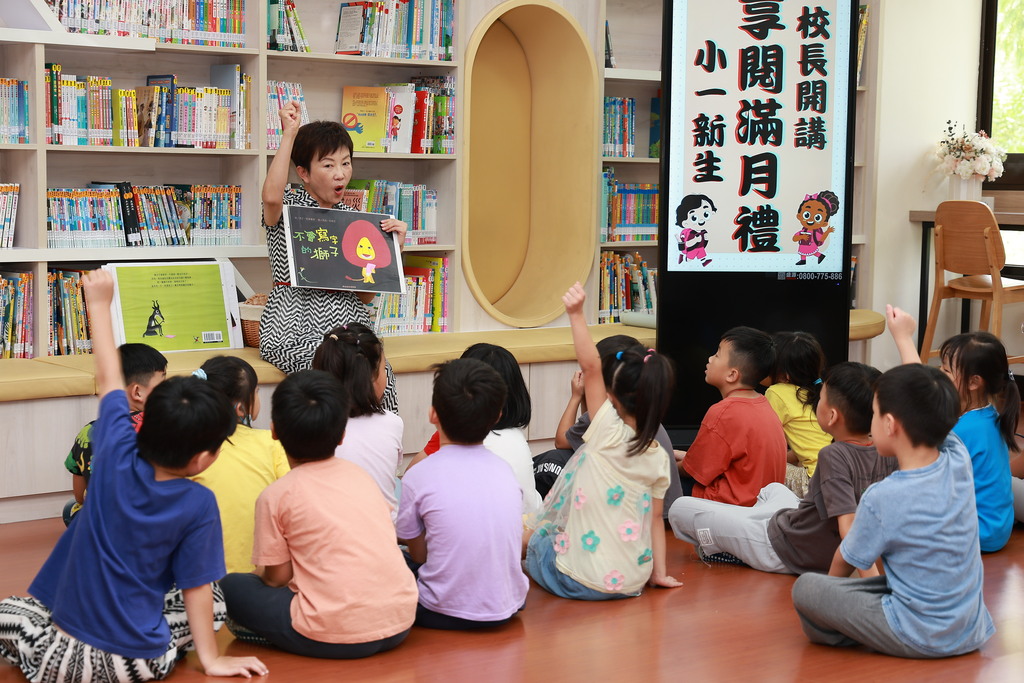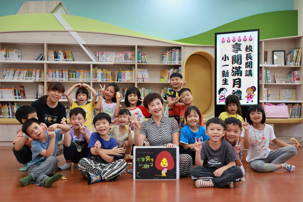 小一新生開學滿月了~大坑國小特別舉辦「享閱滿月禮」。秀美校長親自為孩子們一班一班用大書說繪本《不會寫字的獅子》。故事中,小獅子因為不會寫字而陷入困境,到處找森林裡的動物協助,卻鬧出一連串笑話,引起了孩子們的專注與好奇,小朋友聽得聚精會神,隨著劇情時而驚訝、時而大笑,氛圍溫馨熱鬧。