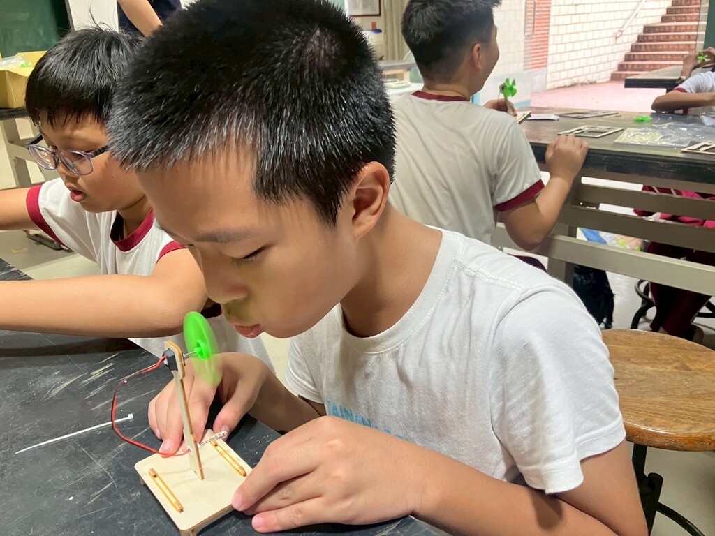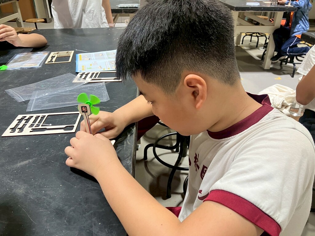 接著,大家來到室內教室,課程從「什麼是自然能源」開始談起,逐步引導孩子們認識自然能源的利用方式。隨後進入最令人期待的實作環節──手作微型風力發電小電扇。孩子們專注地組裝零件,完成後各自進行測試:有人用力吹氣帶動葉片轉動,有人把作品放到電風扇前檢驗成果。當小電扇開始轉動並驅動小電燈泡時,孩子們臉上都露出了驚喜的笑容。