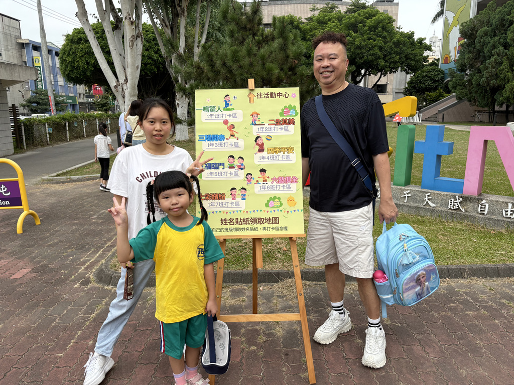 為了讓孩子們帶著滿滿的祝福與力量踏入校門,一系列寓意深遠的儀式成為迎新的重頭戲。當孩子們找到自己的姓名貼紙後,便迎來了第一個重要的合影時刻。每一班都有一個獨特而美好的期許,例如 1 班的【一鳴驚人】象徵潛力無限,5 班的【五福臨門】期盼健康、快樂、智慧、勇氣全到位。孩子們在這些「特色打卡板」前,與家人定格下這份獨特的期待,將夢想的種子悄悄埋下。