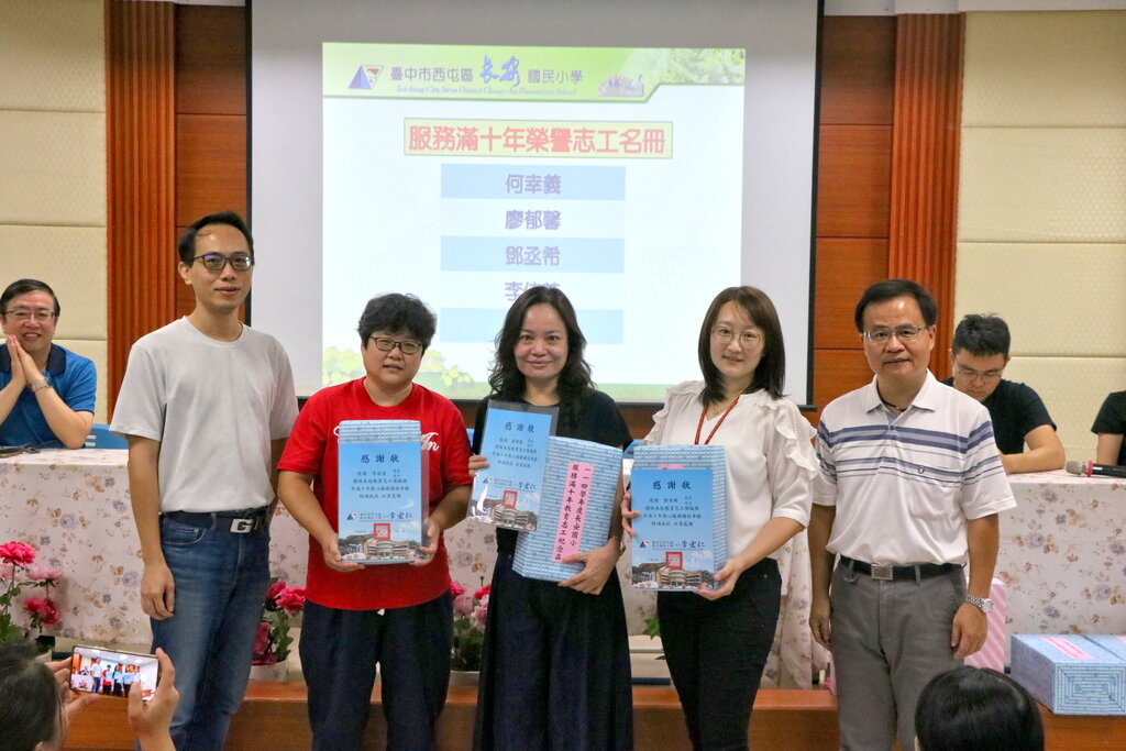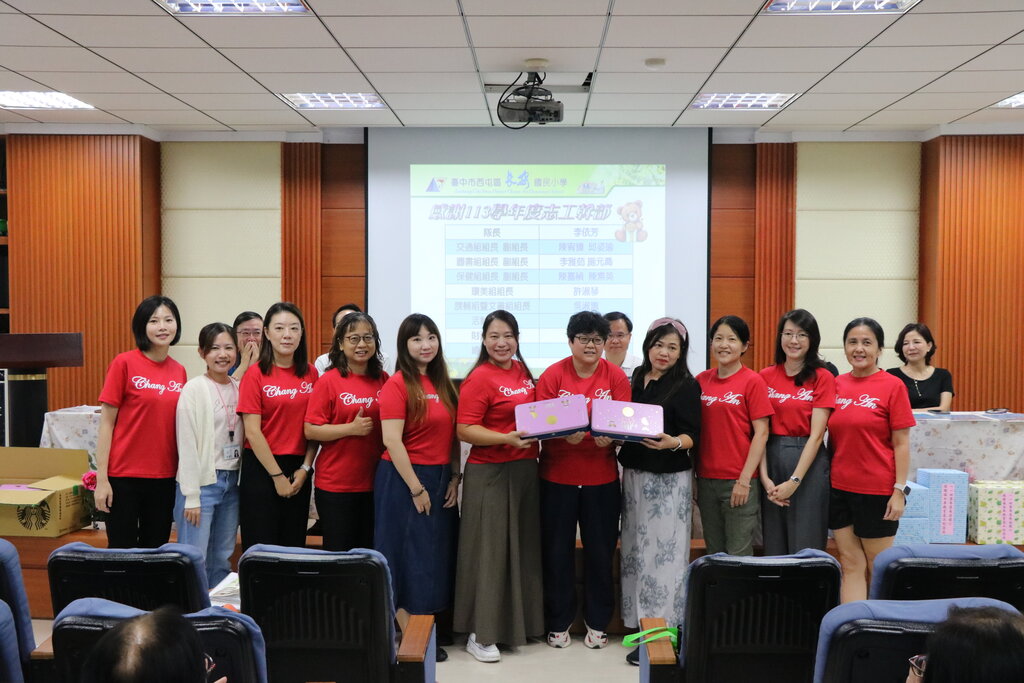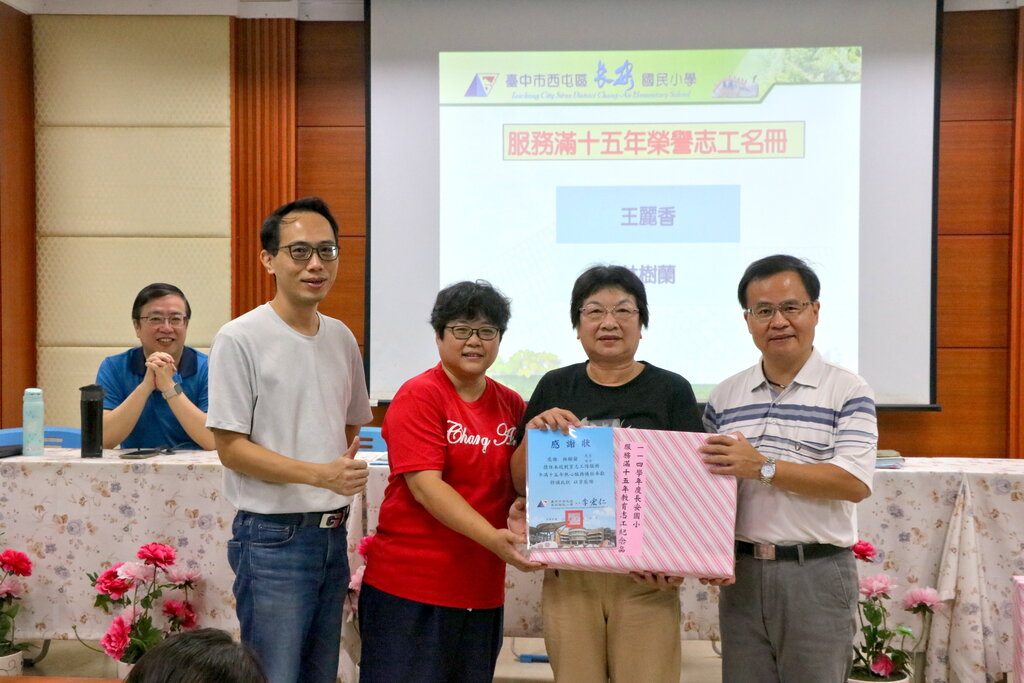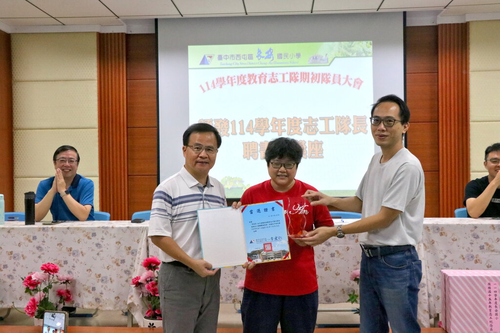 接著感謝113學年度的幹部及服務滿十五年、十年、五年及三年的資深志工,介紹114學年度的幹部及新進志工。大家用愛接力,因此志工隊點點滴滴都是感人的故事,夥伴們用愛與溫馨溫暖了全校親師生。