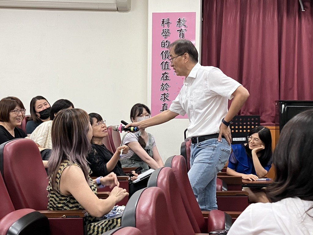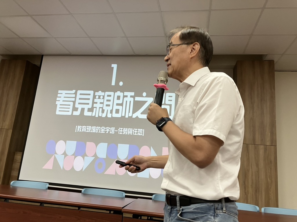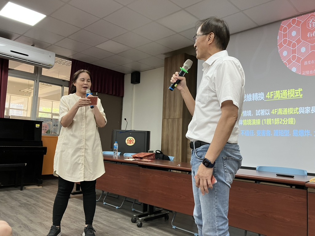 「我們與家長溝通時要善用F4…」今天週三教師進修教務處特別邀請惠來國小林校長蒞校分享親師溝通的秘訣。林校長以實例及理論為基礎,輔以教師實作及心得分享,林校長認為:良師興國,教育浪潮的翻轉已成為教育人的挑戰如何提升教師專業精神與敬業態度,以前瞻未來教育趨勢。林校長學養豐富敘事幽默,讓與會教師收穫滿滿!