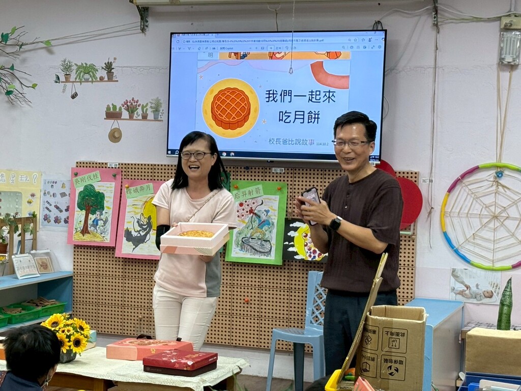隨著簡報畫面在大螢幕上緩緩展開,校長以溫柔而富有表情的語調,娓娓道來嫦娥奔月、玉兔搗藥等關於中秋節的傳說,引領孩子們一步步走進月亮的世界。當故事中的月餅「神秘失蹤」,孩子們全神貫注、眼神閃亮,在笑聲與驚呼中,也開始思考——月餅除了是甜甜的點心,還藏著哪些有關「思念」與「團圓」的深情呢?