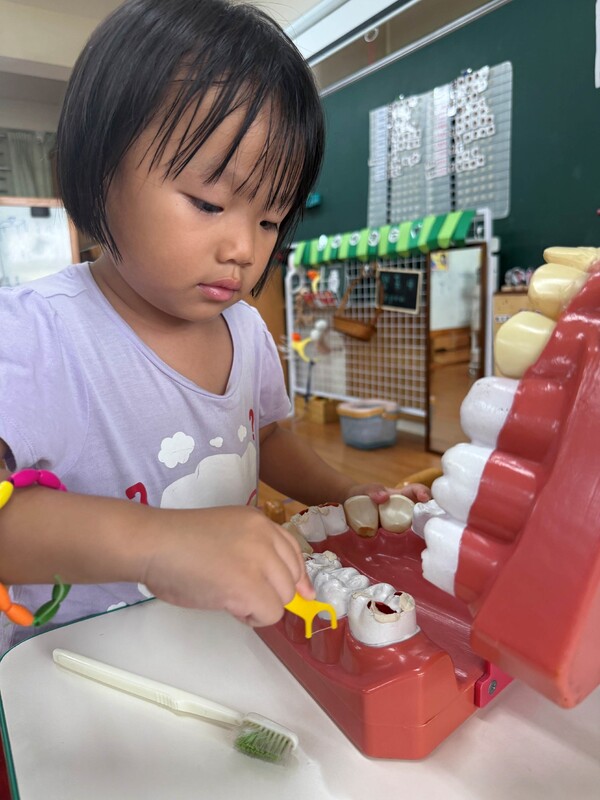 開學將近一個月,孩子們從一開始的哭哭聲中,漸漸轉換為歡樂的歌唱旋律,也開始熟悉班級例行性活動中的每一件事與各個學習區的操作方式。生活自理中的刷牙怎麼能錯過呢!這件每天都要做的事情一定要正確的完成它!大家從《刷刷牙大作戰》這首歌開始,再用繪本《搶救牙齒大街》引起孩子們對於保護牙齒的學習動機,我們一起練習貝氏刷牙法,也認識了牙線的重要,在教室用牙齒模型實際練習如何挑牙線、刷牙,中午用餐後的潔牙活動,也很努力的運用在課堂中學習的貝氏刷牙法認真將牙齒刷乾淨喔!希望大家都能在飯後、睡前能夠將牙齒清潔乾淨保護好~